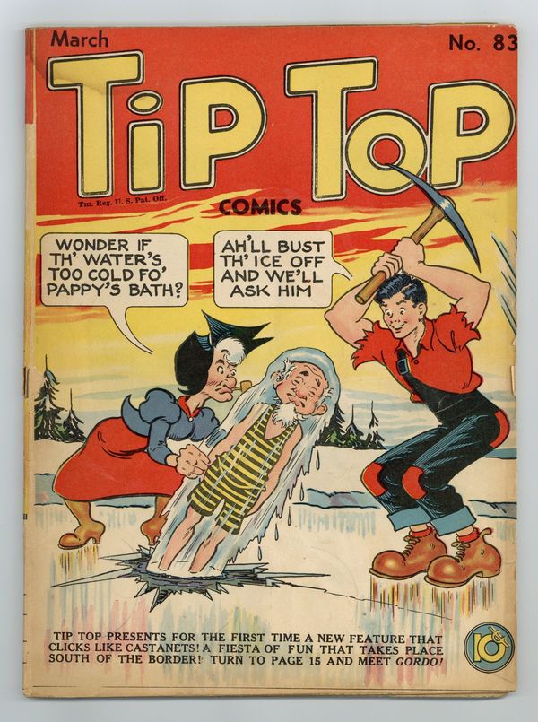 Cover by Al Capp. Stories and art by Al Capp, Ernie Bushmiller, Rudolph Dirks, Gus Mager, Dick Moores, Fred Methot, Reg Greenwood, Hal Forrest, Bernard Dibble, Gus Arriola and John Hix. Sometimes listed as Tip Top Comics Vol. 7 #11. Tip Top Comics presented color reprints of United Features newspaper comic strips. Pepito introduces the latest strip to join Tip Top Comics, Gus Arriola's Gordo. Phil Fumble takes Fritzi Ritz to a nightclub with a floor show, in a strip that showcases Ernie Bushmiller's good-girl art. The Triple Terror team works as ground scouts in the Aleutians to guide approaching air and sea forces, but after Menta is injured, Lectra and Chemix must carry on alone. Plus a Li'l Abner storyline by Al Capp. Li'l Abner; The Captain and the Kids; The Mirror Man; The Triple Terror; Jim Hardy; Stamp Tips; Gordo; Looy Dot Dope; Tailspin Tommy; Iron Vic; Phil Fumble; Fritzi Ritz; Funny Side Up!; Strange as It Seems; Back Home Again. 64 pages, Full Color. Cover price $0.10.