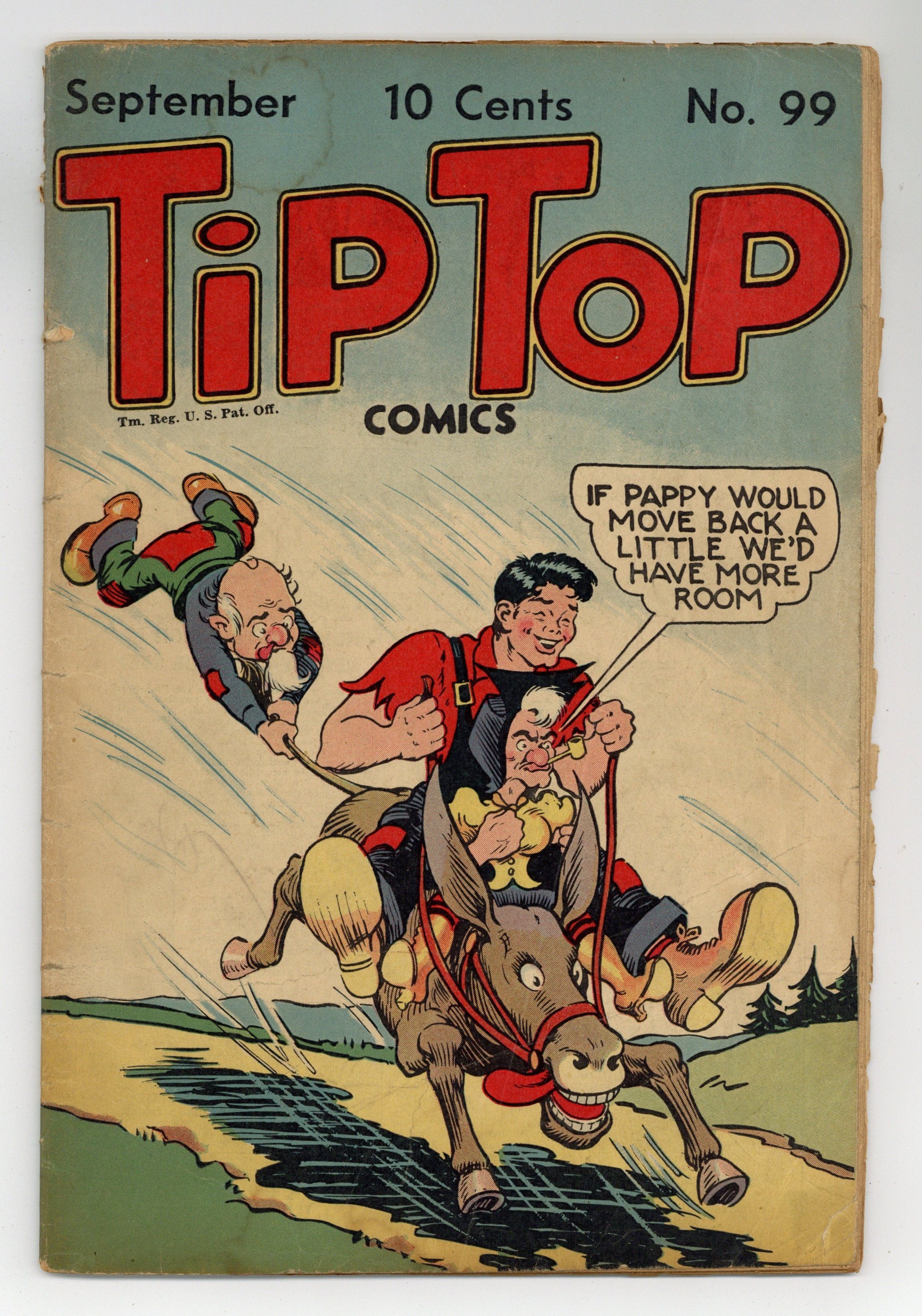 Cover by Ernie Bushmiller. Stories and art by Al Capp, Ernie Bushmiller, Rudolph Dirks, Gus Mager, Dick Moores, Fred Methot, Paul Berdanier, Hal Forrest, Bernard Dibble, John Hix and Gus Arriola. Sometimes listed as Tip Top Comics Vol. 9 #3. Tip Top Comics presented color reprints of United Features newspaper comic strips. The Mirror Man and Slim are on the trail of poisoned booze in China when they are caught between snipers and booby traps. A quiet day of fishing for the Captain and the Inspector is ruined when they accidentally upset a hippo. Just as Marryin' Sam is about to pronounce Li'l Abner married to Widder Wildcat, the lights go out. Li'l Abner; The Captain and the Kids; The Mirror Man; The Triple Terror; Jim Hardy; Tailspin Tommy; Stamp Tips; Gordo; Bill Bumlin; Nancy; Fritzi Ritz; How It Began; Strange as It Seems. 48 pages, Full Color. Cover price $0.10.