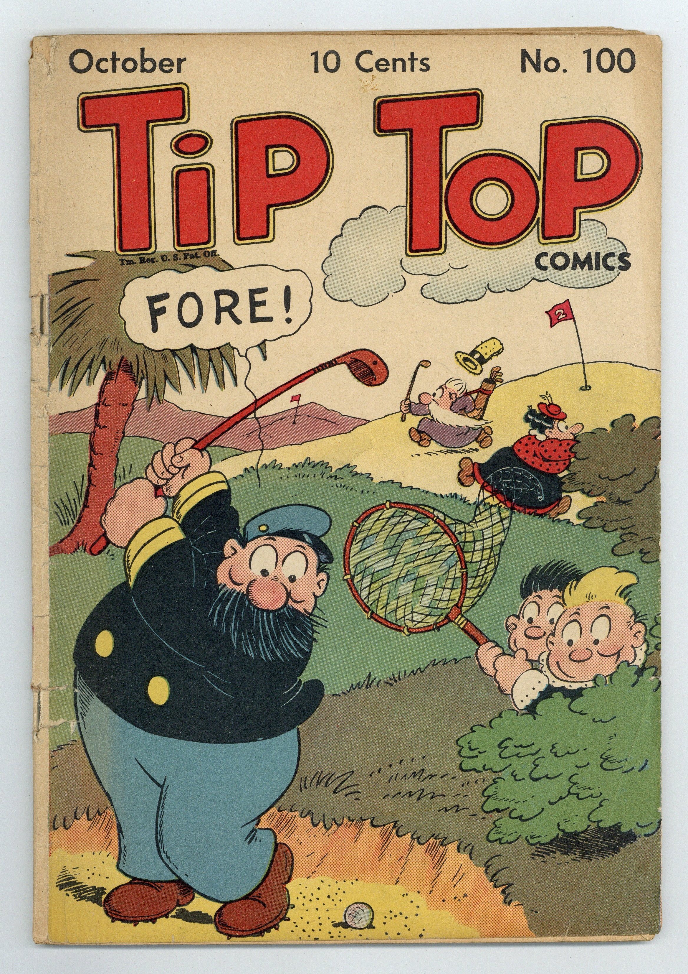 Cover by Rudolph Dirks. Stories and art by Al Capp, Ernie Bushmiller, Rudolph Dirks, Gus Mager, Dick Moores, Fred Methot, Paul Berdanier, Hal Forrest, Bernard Dibble, John Hix and Gus Arriola. Sometimes listed as Tip Top Comics Vol. 9 #4. Tip Top Comics presented color reprints of United Features newspaper comic strips. The Mirror Man investigates a mysterious kite that appears over China just before attacks on Allied forces, in his final appearance. Fritzi's new dog "Pal" leads Phil into a backstage burlesque show, in a strip showcasing Ernie Bushmiller's fashion designs and good-girl art. Bill Bumlin goes to meet his orphaned nephew Hinky at the train station, but trouble begins after he picks the wrong kid. Plus a Li'l Abner storyline by Al Capp. Li'l Abner; The Captain and the Kids; The Mirror Man; The Triple Terror; Jim Hardy; Tailspin Tommy; Stamp Tips; Gordo; Bill Bumlin; Nancy; Fritzi Ritz; How It Began; Strange as It Seems. 48 pages, Full Color. Cover price $0.10.