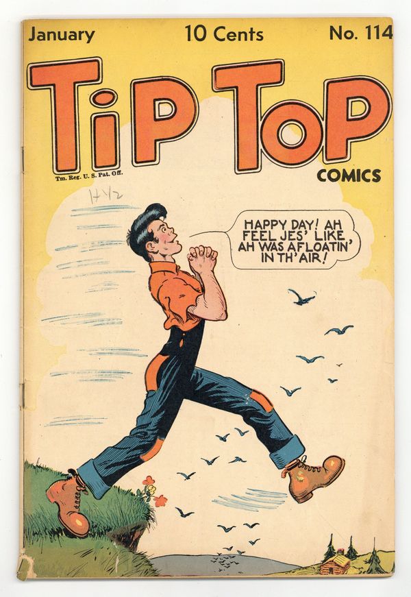 Cover by Al Capp. Stories and art by Al Capp, Ernie Bushmiller, Rudolph Dirks, Dick Moores, Fred Methot, Paul Berdanier, Sam Leff, Ed Dodd, Charles Plumb, and John Hix. Sometimes listed as Tip Top Comics Vol. 10 #6. Tip Top Comics presented color reprints of United Features newspaper comic strips. Joe Jinks finally tracks down the long-lost son of legendary boxer Killer Kayoe, and the legend of Curly Kayoe begins. Phil and Fritzi visit a ballet company backstage and find them listening to the latest "boogie woogie" music, and saying "hep" phrases like "hotcha" and "Swing me, gate!" Bill Bumlin tries out his nephew's "how to be a detective" kit, with disastrous results. Plus a Li'l Abner storyline by Al Capp. Li'l Abner; The Captain and the Kids; The Triple Terror; Jim Hardy; Stamp Tips; Curly Kayoe; Back Home Again; Ella Cinders; Bill Bumlin; The Burtons; Strange as it Seems; Nancy; Fritzi Ritz; How It Began. 48 pages, Full Color. Cover price $0.10.