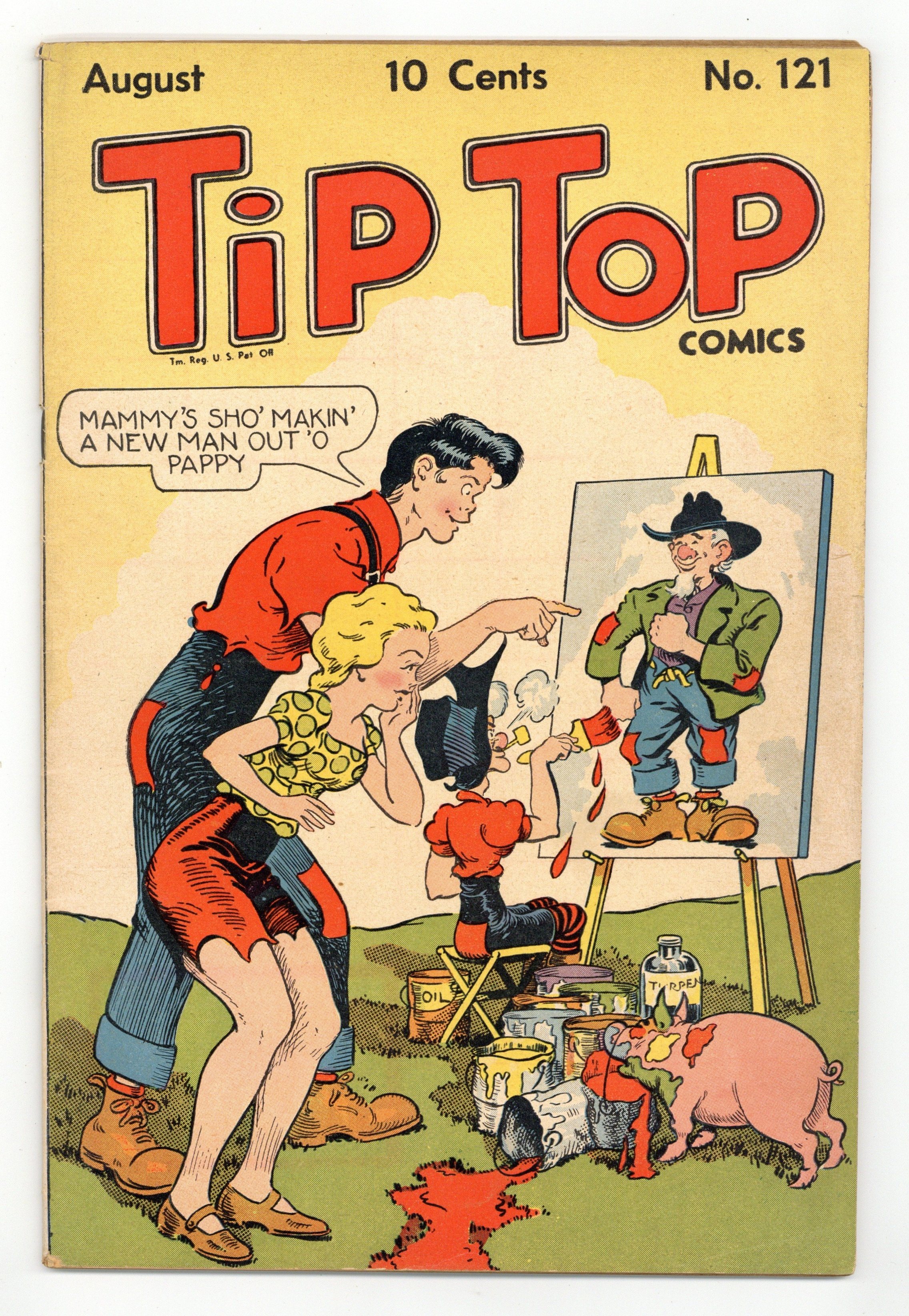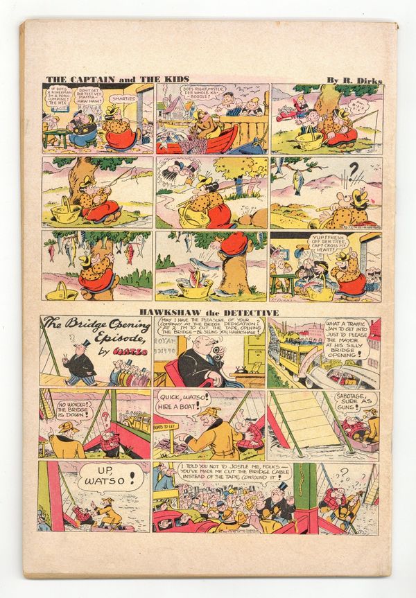 Tags: Comic Strip ReprintsPublished Aug 1946 by United Features Syndicate.$35.00Cover by Al Capp. Stories and art by Al Capp, Ernie Bushmiller, Rudolph Dirks, Fred Methot, Paul Berdanier, Sam Leff, Ed Dodd, Charles Plumb, Arnie Mossler, Merrill Blosser, and Dick Moores. Sometimes listed as Tip Top Comics Vol. 11 #1. Tip Top Comics presented color reprints of United Features newspaper comic strips. After a ruffian steals Dinky's new baseball glove, a passing baseball star makes him a batboy and puts him on the real diamond. Bathless Groggins and Haggis invent the world's strongest glue, then get stuck to each other. But little do they know that the same woman is secretly dating both of them! Windy starts to suspect that maybe Partha Plant means harm to his adopted baby. Plus a Li'l Abner storyline by Al Capp. Li'l Abner; The Captain and the Kids; The Triple Terror; Stamp Tips; Curly Kayoe; Abbie an' Slats; Ella Cinders; Bill Bumlin; Back Home Again; Jim Hardy; Freckles and His Friends; The Young Idea; Nancy; Fritzi Ritz; How It Began. 48 pages, Full Color. Cover price $0.10.