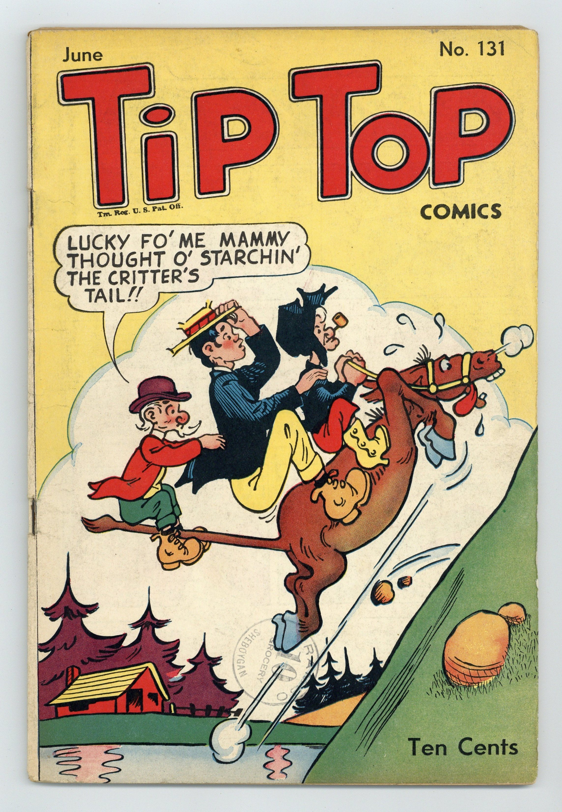 Cover by Al Capp. Stories and art by Al Capp, Ernie Bushmiller, Rudolph Dirks, Sam Leff, Bernard Dibble, Ernest Hix, Raeburn Van Buren and Gustavo Arriola. Sometimes listed as Tip Top Comics Vol. 11 #11. Tip Top Comics presented color reprints of United Features newspaper comic strips. Bathless Groggins' latest invention makes him invulnerable to injury or pain, in an Abbie an' Slats strip with nice art by Raeburn van Buren. Curly Kahoe is declared champion after his double-knockout bout with Dynamite Dunn. Plus a Li'l Abner storyline by Al Capp. Li'l Abner; The Captain and the Kids; Stamp Tips; Curly Kayoe; Abbie an' Slats; El Bombo; Back Home Again; Gordo; Nancy; Fritzi Ritz; Strange as It Seems; How It Began. 48 pages, Full Color. Cover price $0.10.