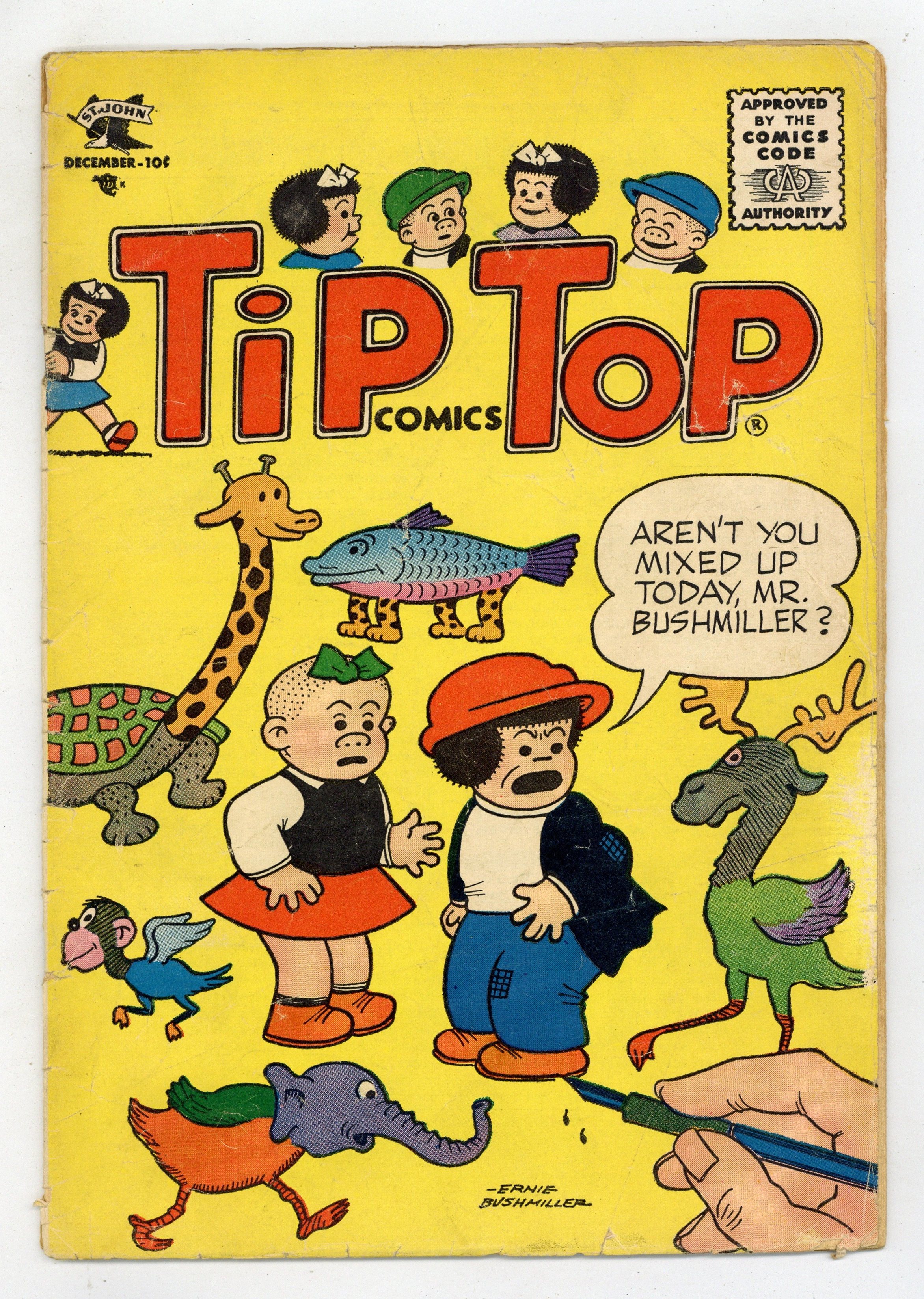 Cover by Ernie Bushmiller. Stories and art by Charles Schulz, Ernie Bushmiller, and Rudolph Dirks. Tip Top Comics presented color reprints of United Features newspaper comic strips. One of the backup strips in the comic is Charles Schulz's Peanuts, then only in its sixth year; several daily strips are presented in full color. The Captain and the Inspector want to become cowboys, but a stray lion puts a quick end to that fantasy. Rabbit cowboy Kid Carrots offers to trade places with Grandpaw Grizzly. Nancy has the report-card blues. Meta cover by Ernie Bushmiller is pure "Duck Amuck." The Family Scrapbook; Nancy; Peanuts; The Captain and the Kids; Kid Carrots. 32 pages, Full Color. Cover price $0.10.