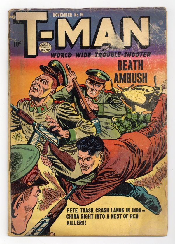 Stories by unknown. Art by unknown. T-Man Pete Trask crash-lands in Indo-China right into a nest of red killers in "Death Ambush!" Also in this issue: T-Man in "Moscow's Merchant of Murder"; T-Man Nevins in "The Big Frame-Up"; 1-page text story "Top Secret," reprinted from Blackhawk (1944 1st Series) #64; and T-Man in "Herr Hijack!" 32 pages, full color. Cover price $0.10.