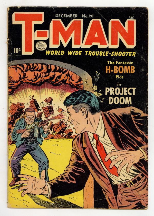 Cover pencils by John Rosenberger. Stories by unknown. Art by John Rosenberger, Charles Sultan and unknown. In this issue: T-Man in "Project Doom" with pencils by John Rosenberger - A plot to assassinate all of the free world's leaders during a meeting in Stockholm is revealed in papers delivered to Trask by a Russian agent; T-Man Bart Fabian in "Ransom for Death" with pencils by Charles Sultan - Film cans are stolen from a Hollywood set making a pirate movie; T-Man in "Red Ring of Fire!"; 1-page text story "The Perfect Double Cross," reprinted from Blackhawk (1944 1st Series) #78; and T-Man in "The City of Spies" - An American diplomat is hypnotised by a French communist to obey a delayed hypnotic command to kill a North African caliph. 32 pages, full color. Cover price $0.10.