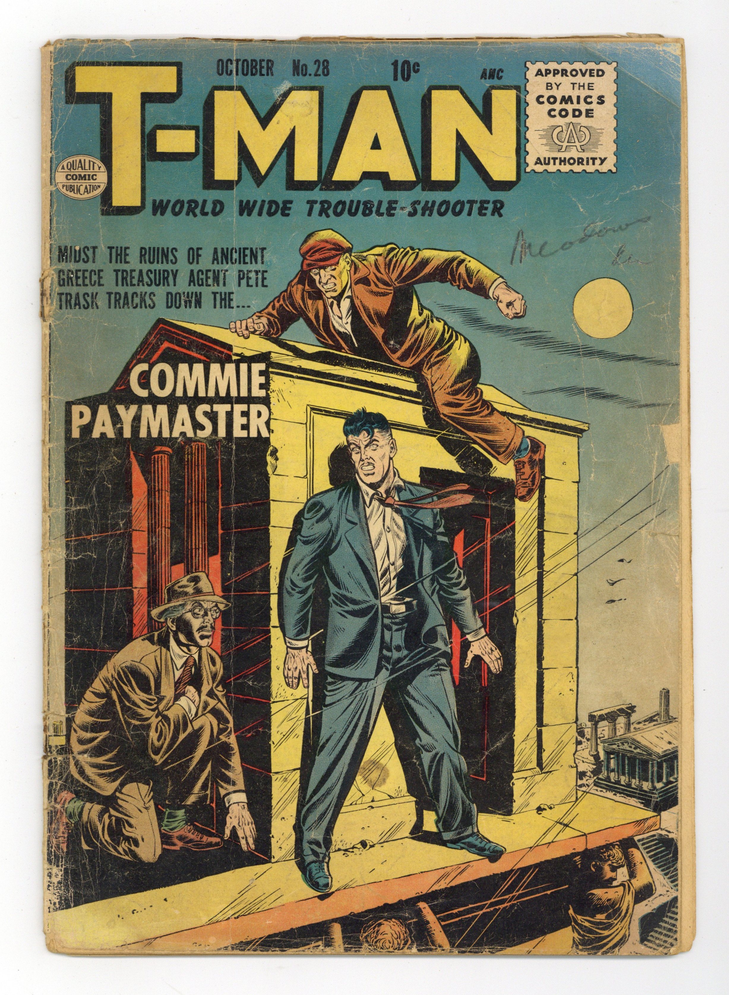 Stories by unknown. Art by W.G. Hargis and unknown. In this issue: Amidst the ruins of ancient Greece, Treasury Agent Pete Trask tracks down the..."Commie Paymaster!" Also in this issue: Inspector Denver in "The Mystery of the Missing Shoes!" with art by W.G. Hargis, reprinted from Police Comics (1941) #119 (note: missing page 2, modified dialogue); T-Man in "International Frameup!", reprinted from Police Comics (1941) #118; 1-page text story "The Case of the China Cat," reprinted from Ken Shannon (1952) #2; and T-Man in "The Red Racket!", reprinted from Police Comics (1941) #120. 32 pages, full color. Cover price $0.10.