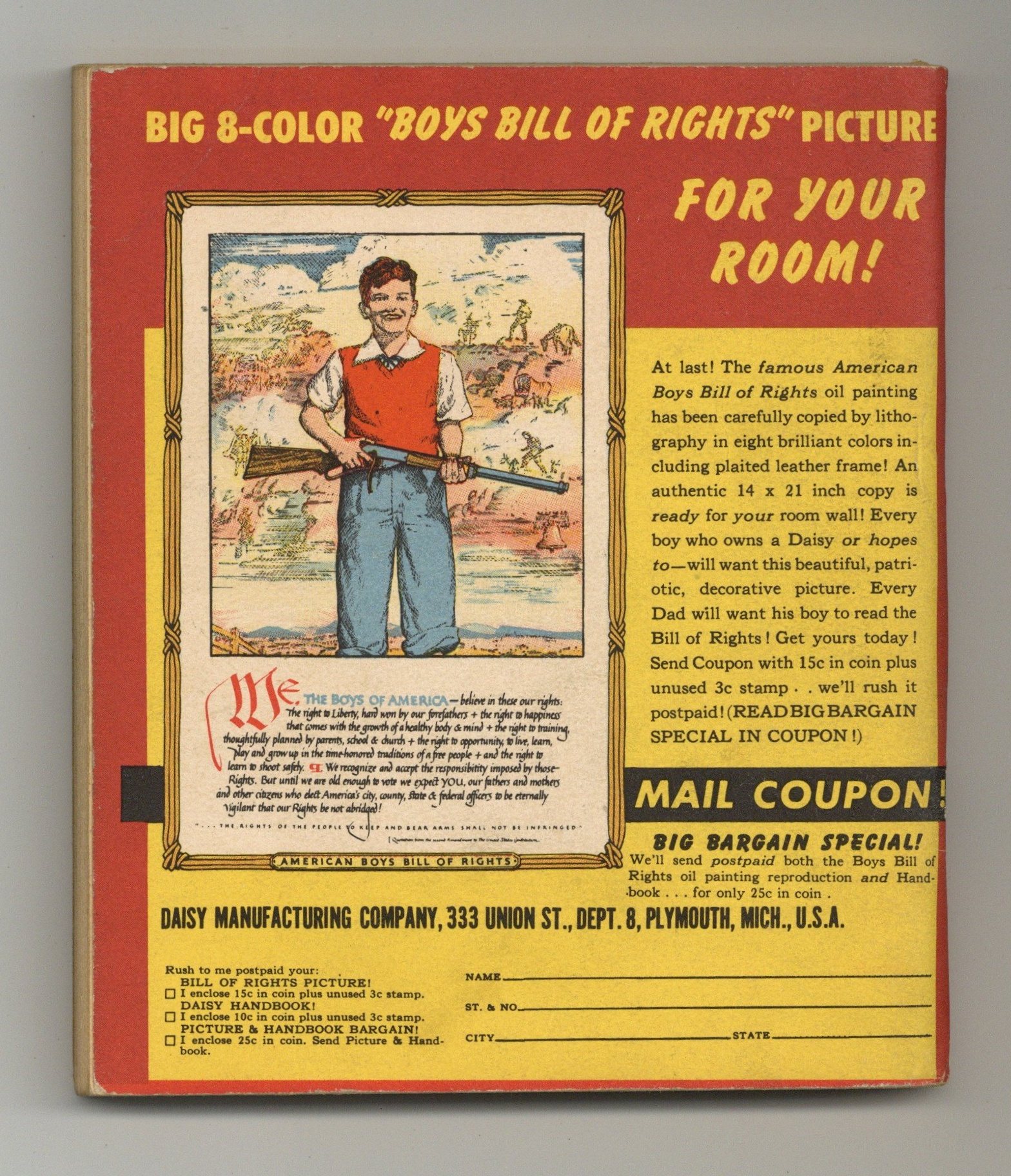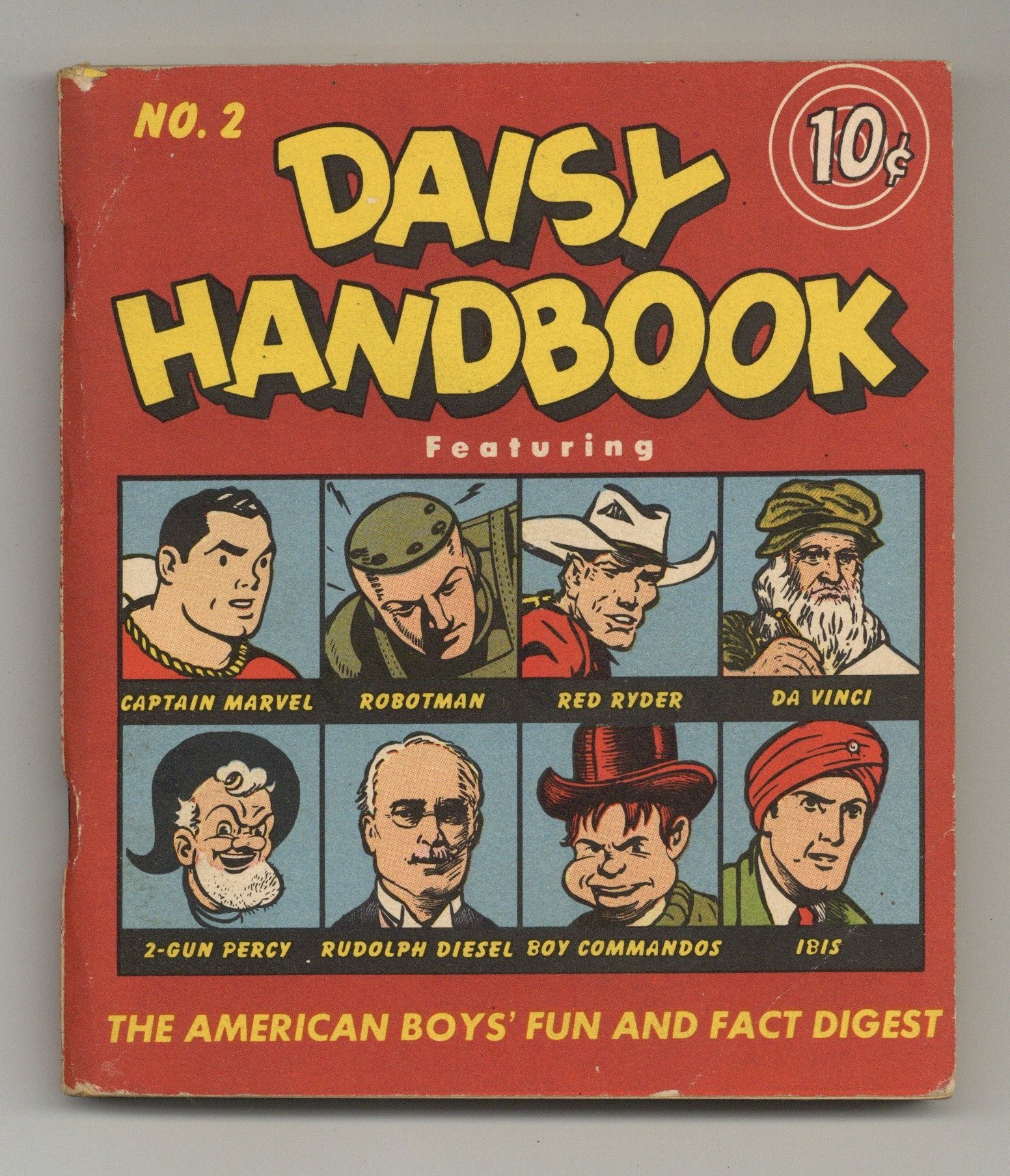 DAISY HANDBOOK # 2, published 1948 by the Daisy Manufacturing Company. Daisy Air Rifle ads were very frequently and prominently featured in comic books for many decades starting in the 1940's. This book is very unusual, because it has comic book features from several different publishers: DC, Fawcett, Dell and True Comics (Parents Magazine Institute). It also has a 10 cent cover price, rather than being a promotional giveaway. The book was primarily sold through the mail. The book is pocket digest size and 132 pages, including covers. The comics are in black and white. Features include Captain Marvel (Shazam), Robotman (who was a backup feature in Action Comics with Superman), Red Ryder by Fred Harman, the Boy Commandos, Ibis the Invincible, and the humorous "Culture Corner" by Basil Wolverton. There are also real fact features on Leonardo Da Vinci, Rudolph Diesel, and Cleveland Indians Hall of Fame baseball player Bob Feller. The center is an 8 page full-color Daisy catalog, featuring Red Ryder and showcasing such products as the 1000 shot repeater cowboy carbine, the number 118 pistol target set, the daisy pump gun (king of all air rifles), daisy bullseye shot, the Buck Rogers U 238 Atomic Pistol Holster Set, the Number 71 Daisy Repeating Water Pistol, and more. The back cover has an ad for a poster - "The American Boys' Bill of Rights", featuring a kid holding a rifle. Cover price $0.10.