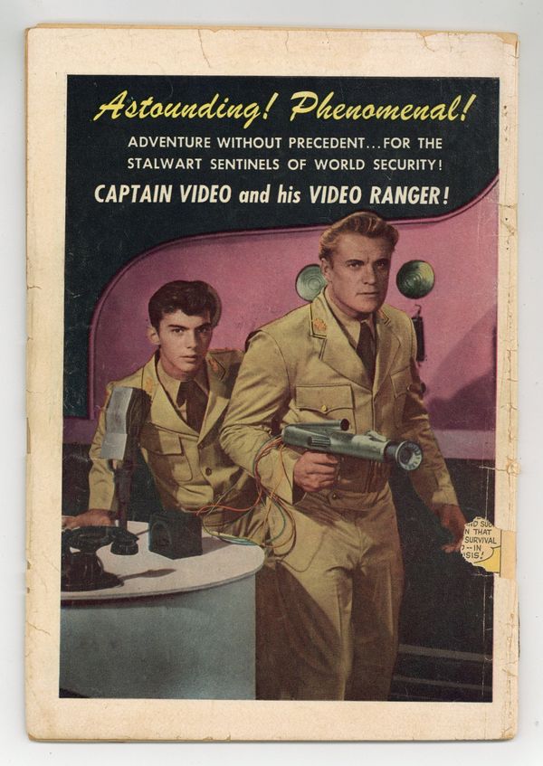Stories and art by George Evans and Clem Weisbecker. Early TV superhero Captain Video comes to comics, an electronics wizard from an era when technology was just starting to change the world. Cap and Ranger investigate after a mystery ailment leaves the people of the world unable to walk. Western-movie hero Rod Cameron faces a gunslinger who wants to make his reputation for beating Rod in a gunfight, while another merely wishes fame for shooting Rod in the back. Evil Dr. Hypnox returns, wrecking and scavenging ships at sea, until he strikes one containing Captain Video and Ranger. Art by future EC legend George Evans. Plus photos of TV's Captain Video and Ranger, Al Hodge and Don Hastings, including a color photo on the back cover. And moral lessons from Captain Video; ironically, this issue was mentioned in the text of the anti-comics classic Seduction of the Innocent (p. 382) because of "morbid fantasies" (the first story) and the good ol' "injury-to-the-eye motif." Captain Video and the Time When Men Could Not Walk!; Rod Cameron: The Gun Duel!; Captain Video and the Hidden Island; Airfield Al…Relatively Speaking!; The Little Monsters; Captain Video and the Legion of Evil. 48 pages, Full Color. Cover price $0.10.