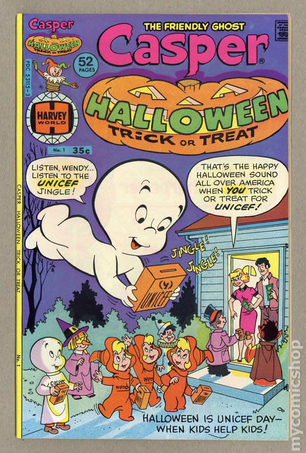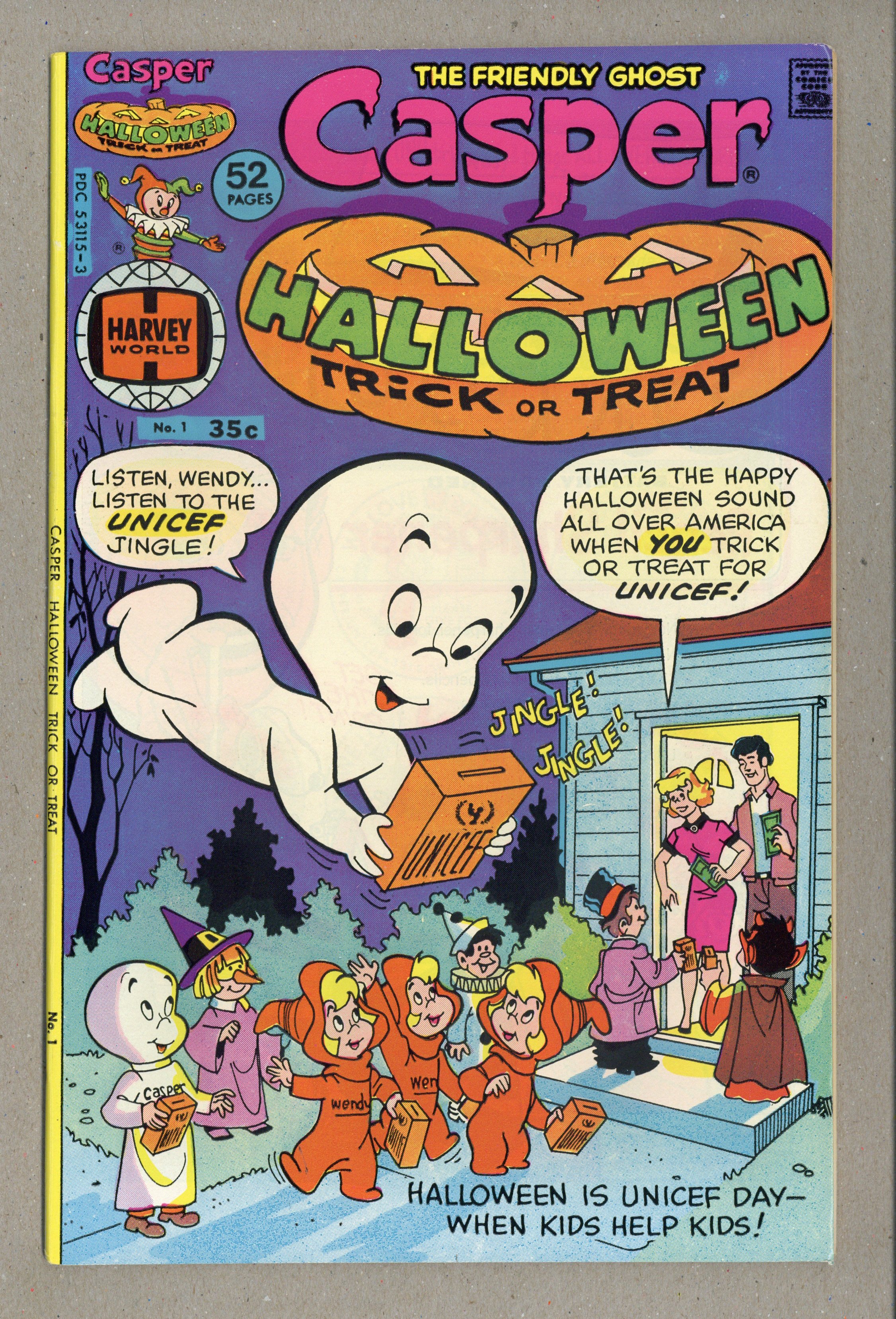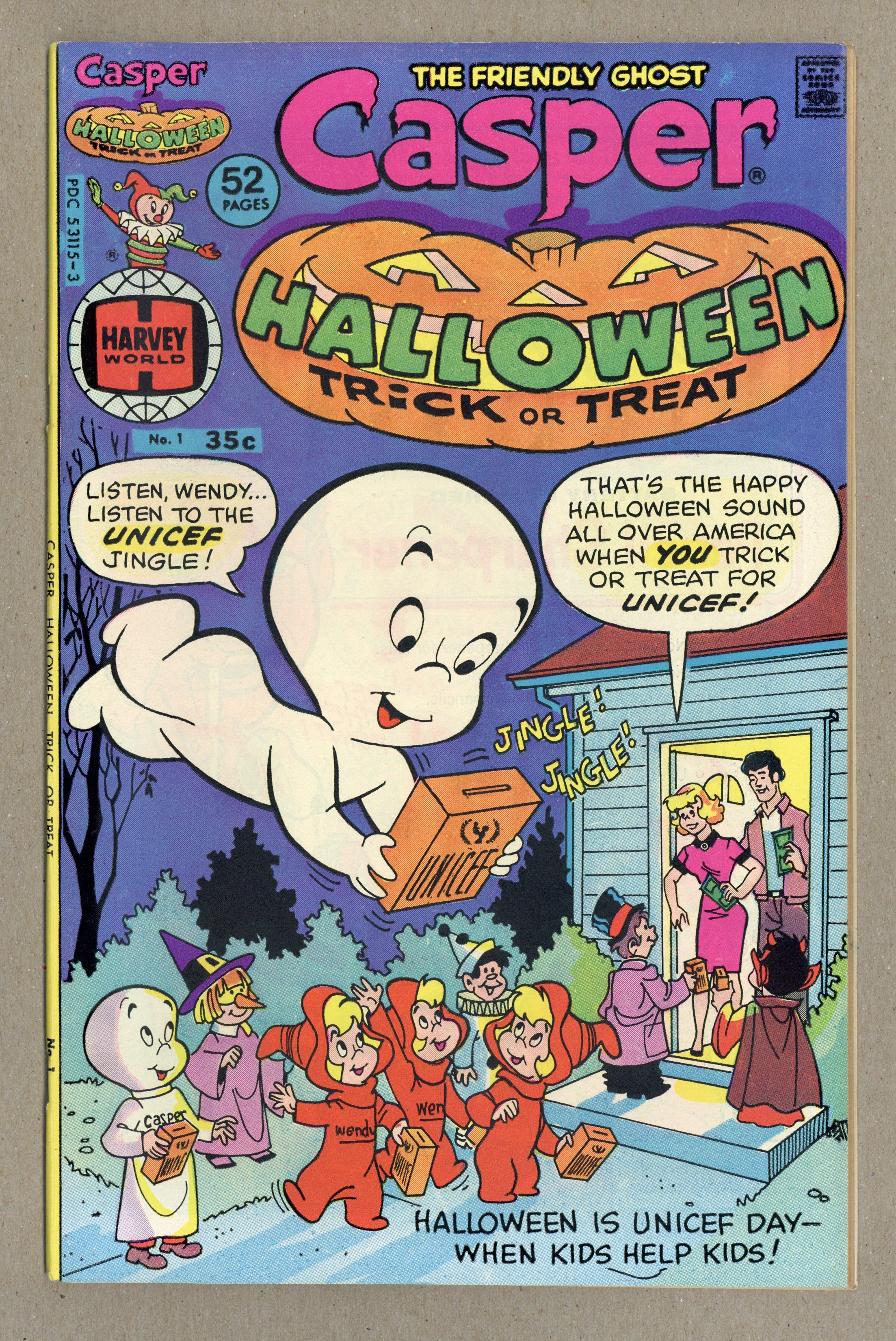 A promotional comic by Harvey to support UNICEF, the United Nations' organization for needy children around the world. Casper and Wendy try to convince demons and The Ghostly Trio to join them in collecting money for UNICEF on Halloween instead of candy. The Giant Sticky-Fingered Halloween Haunt, meanwhile, wants everything for itself. Even Wendy's wicked aunts get into the giving groove. A Very Special Halloween; A Time for Demons; Sticky Fingers; Around the World for UNICEF!; Trick vs. Treat; The Great Halloween Uprising; Sweet Victory. 48 pages, Full Color. Cover price $0.35.