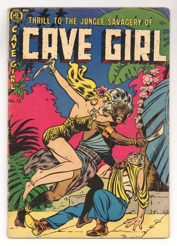 (A-1 No. 96) Stories by Gardner Fox. Art by Bob Powell. Cover by Bob Powell. Sometimes listed as A1 Comics (1944 Life's Romances) #96. Classic good-girl art by Bob Powell, as a girl raised by wolves becomes the jungle hero Cave Girl. White men disguised as natives steal ivory and archaeological treasures; Cave Girl is captured by the Amazons and forced to fight lions; Jungle lord Thun'da must prevent discovery of an ancient machine that can turn anything into gold. Featuring early stories by future comics legend Gardner Fox. The Devil Boat!; Prey of the Headhunters!; The Amazon Assassins!; Thunda: The Gold-Maker! 36 pages, Full Color. Cover price $0.10.