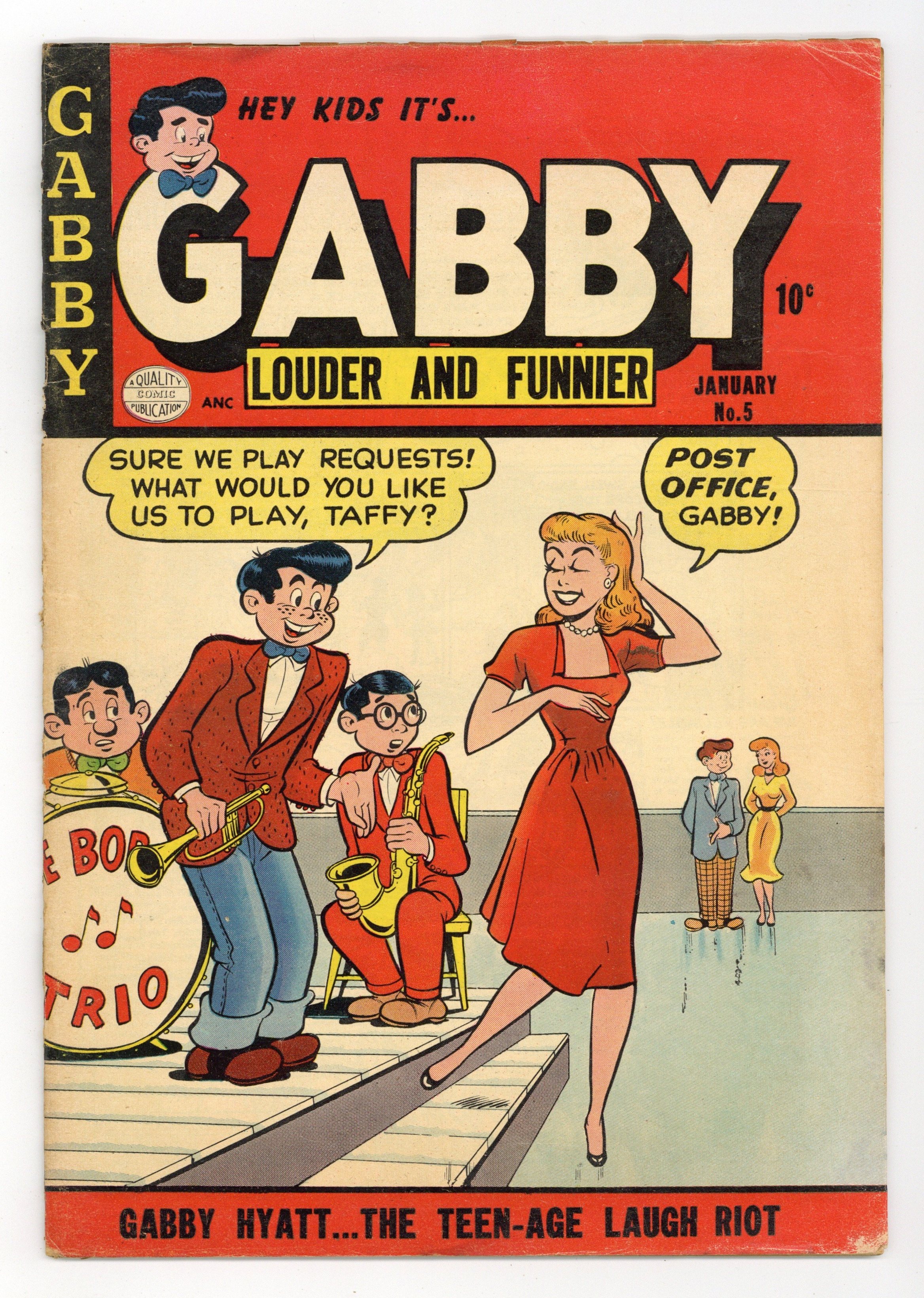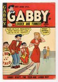 Stories by unknown. Art by unknown. Gabby Hyatt...the teen-age laugh riot! Featuring Gabby in: "This Guy's the Limit"; "The Big Bluff"; "Whoa Is Me!"; and "Service with a Smile!" Characters in these stories: Gabby Hyatt; Taffy O'Toole; Timothy O'Toole (Taffy's father); Coach Grover; Happy; Peahead Wilson; Percy Potts; Spike McBrawn; Chauncey Featherstone; Mrs. Featherstone; Penelope Van Phipps; Rusty; Algy Duckworth [also as Algernon Duckworth]; Mr. Mack. Plus: Ezra in "Tennis Match!" (Note: final appearance, except for reprints.) Characters in this story: Ezra Jones; Rollo Grant. Also: untitled Candy story, reprinted from Candy (1947 Quality) #26. Characters in this story: Candy O'Connor; Ted Dawson; Agnes O'Connor; Tim O'Connor; Trish Traynor; Jim. And: 1-page text story "Ossie Gets Stuck"! Characters in this text story: Ossie; Ed Marks; Marcie; Mary Lou; Robbie Moore. 32 pages, full color. Cover price $0.10.