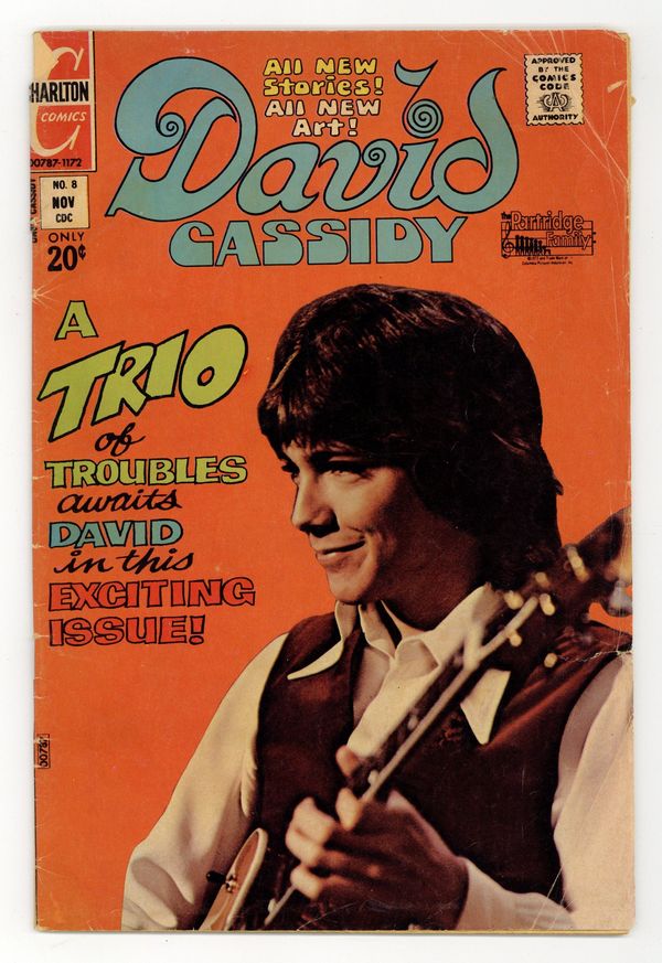 Art by Su Gumen and Charles Nicholas. 1970s teen heartthrob David Cassidy of The Partridge Family gets his own spin-off series, geared toward his legions of fans. David stumbles on a kidnapping plot while visiting the family beach house. In another story, David finds an orphan boy hiding in his car. David auditions to be a circus clown, and learns that comedy is hard work. Plus classic vintage ads for the Partridge Family Fan Club and "David's Private Photo Album." Stormy Weather; The Doubtful Guest; The Magic Hat; Laugh, Clown, Laugh! 32 pages, Full Color. Cover price $0.20.