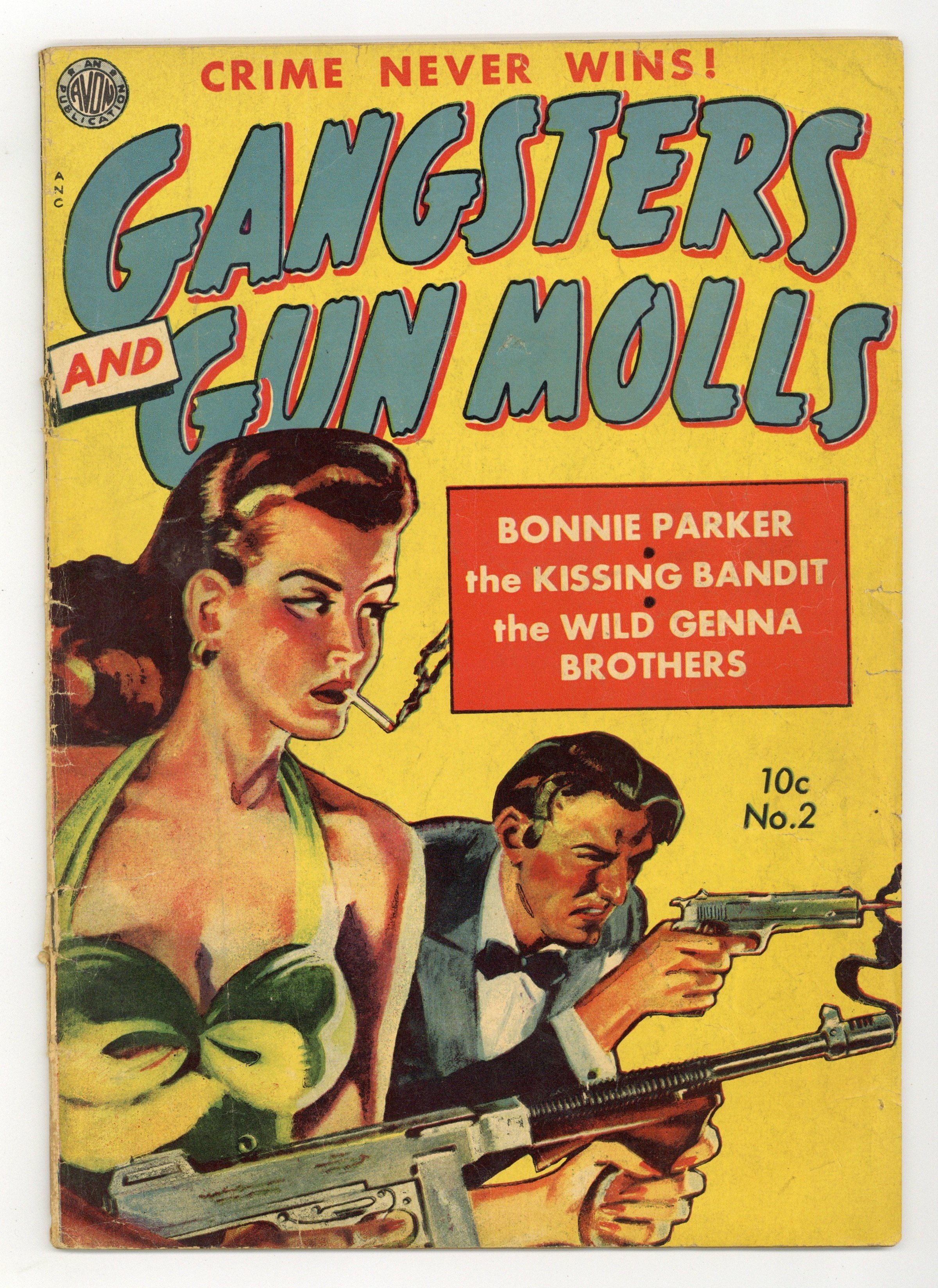 Art by Everett Raymond Kinstler, Sid Check, Ed Goldfarb, Bob Baer, Moe Marcus, Martin Rose and Jack Kamen. Stories about mobsters and the women who love them, with a special focus on women who were notorious criminals in their own right. Edna Murray escapes prison three times, but she kisses one hostage and shes known ever after as the Kissing Bandit; The violent career and demise of legendary bank robbers Bonnie & Clyde; A Saint adventure from All True Detective Cases is reprinted as a Mike Strong detective story. Featuring a painted cover reprinted from one of Avons paperbacks. Edna Murray, the Kissing Bandit!; Bonnie Parker & Clyde Barrow; The Wild Genna Brothers—The Maniac Killers of Chicago!; Murder in Lovers Lane; The Case of the Emerald Robbery! 36 pages, Full Color. Cover price $0.10.