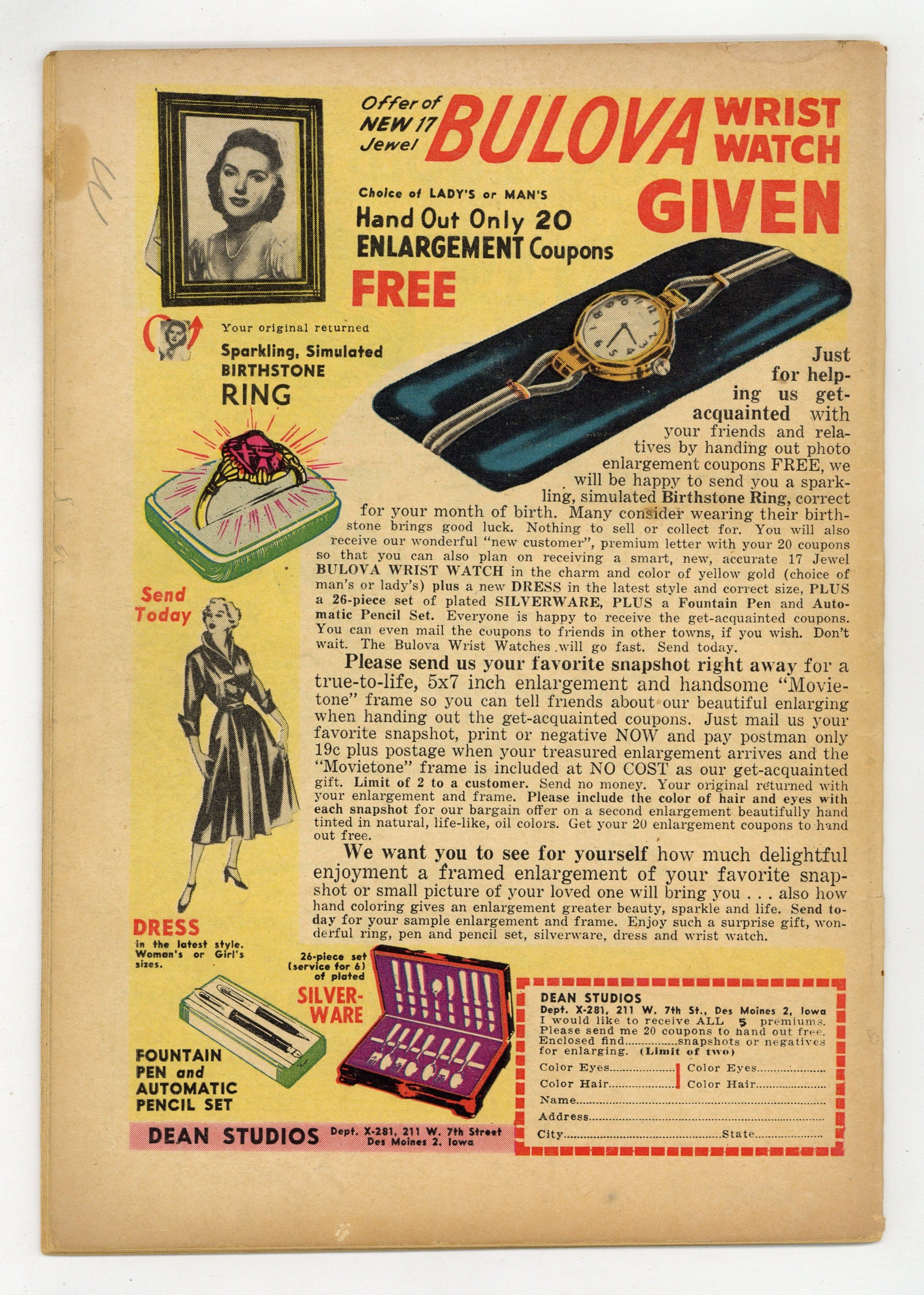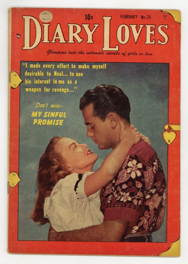 $37.00Photo Cover. Stories by unknown. Art by Ogden Whitney, Leo Morey and unknown. Featuring: "For Better or Worse" starring Beth, John, Roger Wilder and Wendy Stanton; "This Time It's for Keeps" starring Arlene Dyer, Bert, Jerry Goodson, Judy, Lynne, Mrs. Goodson and Tommy Chapman; "West Point Romance" starring Doc Stoddard, Gwen Stoddard, Paula Phillips and Stan Middleton; and "My Sinful Promise" starring Charlene Fellows, Mrs. Fellows, Neal Crandall, Pam and Roger Crandall. Plus: 1-page text story "He's Right for Me" starring Alice Miller, Dan Little and Greg Walters. 32 pages, full color. Cover price $0.10.