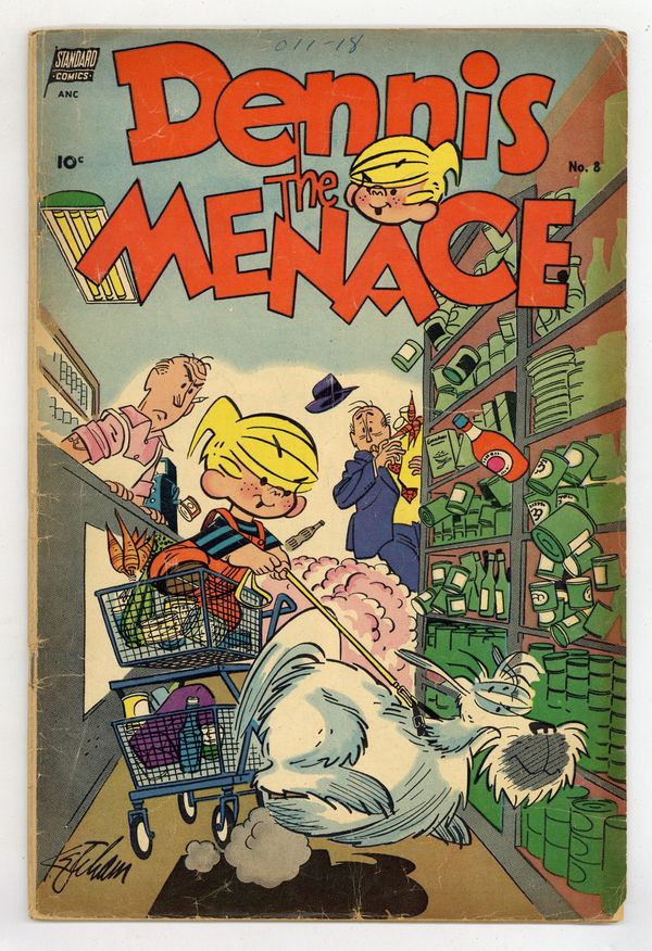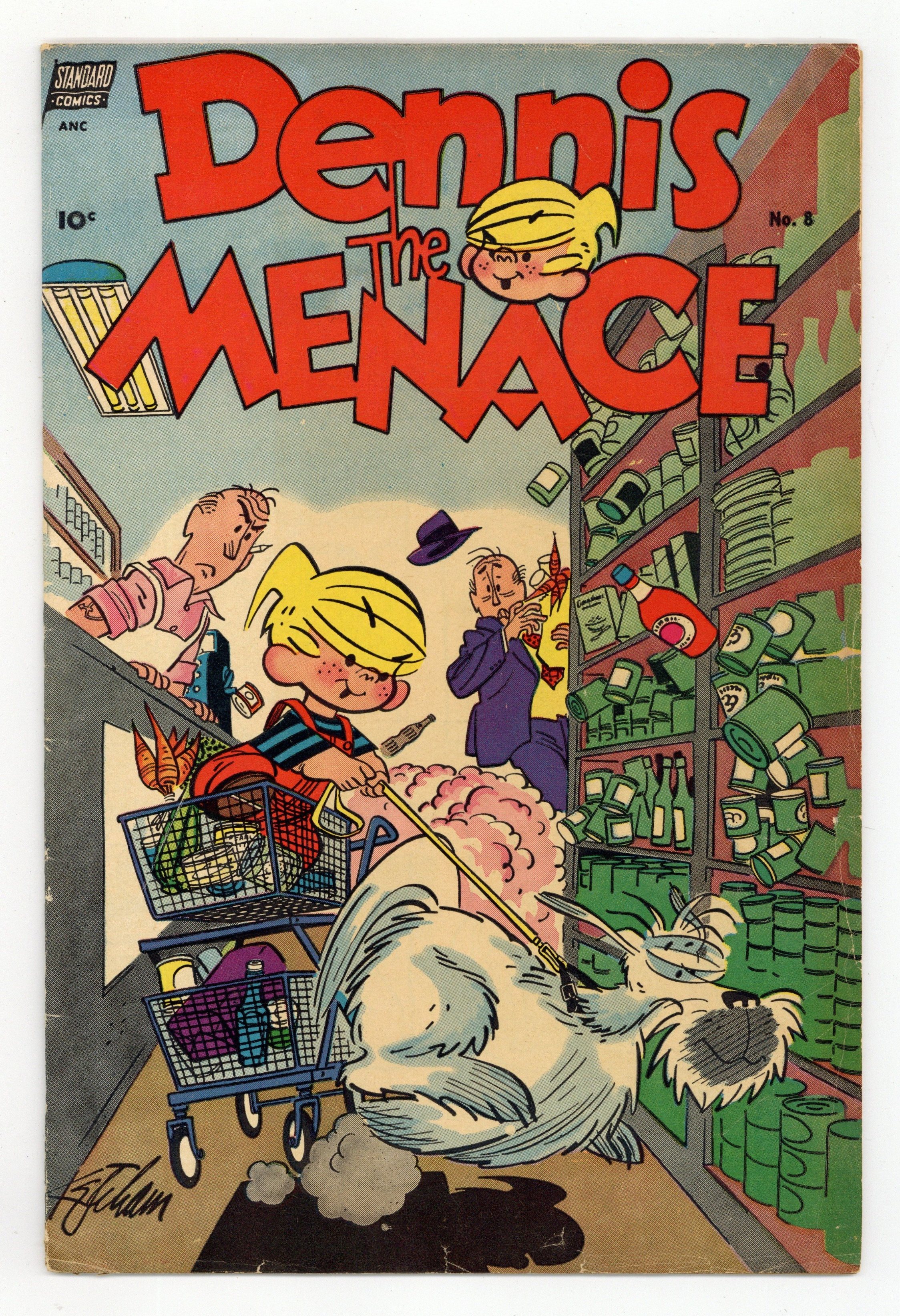 Published Jan 1955 by Standard/Pines/Haliden.$32.00Cover art by Hank Ketcham. Dennis, script by Fred Toole, art by Al Wiseman. Dig That Dennis, script by Fred Toole, art by Al Wiseman. Look Who's Talkin' starring Dennis the Menace, script by Fred Toole, art by Al Wiseman. Trick or Treat! text story. Punky, art by Al Wiseman; Punky gets a bedtime story. A Shopping We Will Go!, script by Fred Toole, art by Al Wiseman. Dennis the Chef, script by Fred Toole, art by Al Wiseman. 36 pgs. $0.10. Cover price $0.10.
