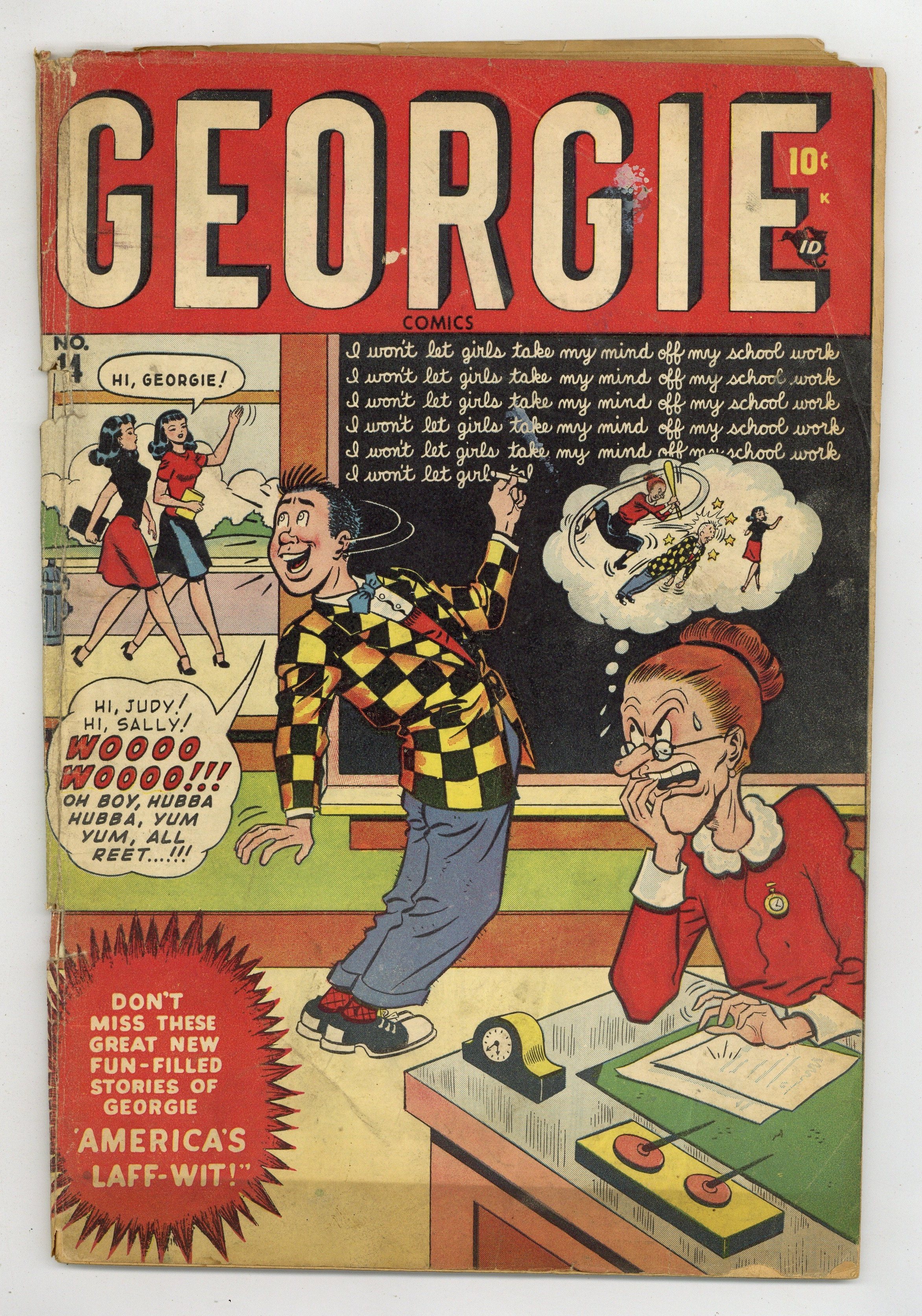Cover by Mike Sekowsky. Stories by Harvey Kurtzman (Hey Look! 1-pager), Basil Wolverton (Dr. Whackyhack 1-pager) and unknown. Art by Mike Sekowsky, Morris Weiss, Harvey Kurtzman (Hey Look! 1-pager), Basil Wolverton (Dr. Whackyhack 1-pager) and unknown. America's laff-wit Georgie stars in four stories with art by Mike Sekowsky: "Georgie Gets Clipped!"; "The Basket-Brawl!"; "The Horrible Hat Happenings!"; and "Stealing the Scene!" Also in this issue: Margie in "The Hammy Hero!" with art by Morris Weiss; 2-page text story "Penthouse Blues"; Frankie in "Kangaroo to You!"; untitled Hey Look! 1-pager by Harvey Kurtzman; untitled Willie 1-pager with art by Mike Sekowsky; and untitled Dr. Whackyhack the Wacky Quack 1-pager by Basil Wolverton. 48 pages, full color. Cover price $0.10.