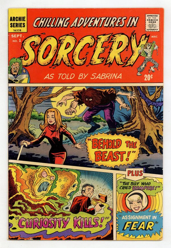 Behold the Beast, script by Frank Doyle, art by Stan Goldberg; Tommy, a freakish boy with four arms, is kept chained up in his parents' attic; When he escapes, an angry mob pursues him into the swamp, where he meets and falls in love with a blind girl who isn't afraid of him. The Boy Who Cried Vampire, script by Frank Doyle, pencils by Dan DeCarlo, inks by Rudy Lapick; Sabrina tells another terrifying tale: at a party, a boy named Stanley meets his uncle Bruce, who grows fangs, hypnotizes him and leaves him with two marks on his neck. Assignment in Fear, script by Frank Doyle, pencils by Dan DeCarlo, inks by Rudy Lapick. Curiosity Kills, script by Frank Doyle, pencils by Stan Goldberg, inks by Henry Scarpelli. 32 pgs. $0.20. Cover price $0.20.