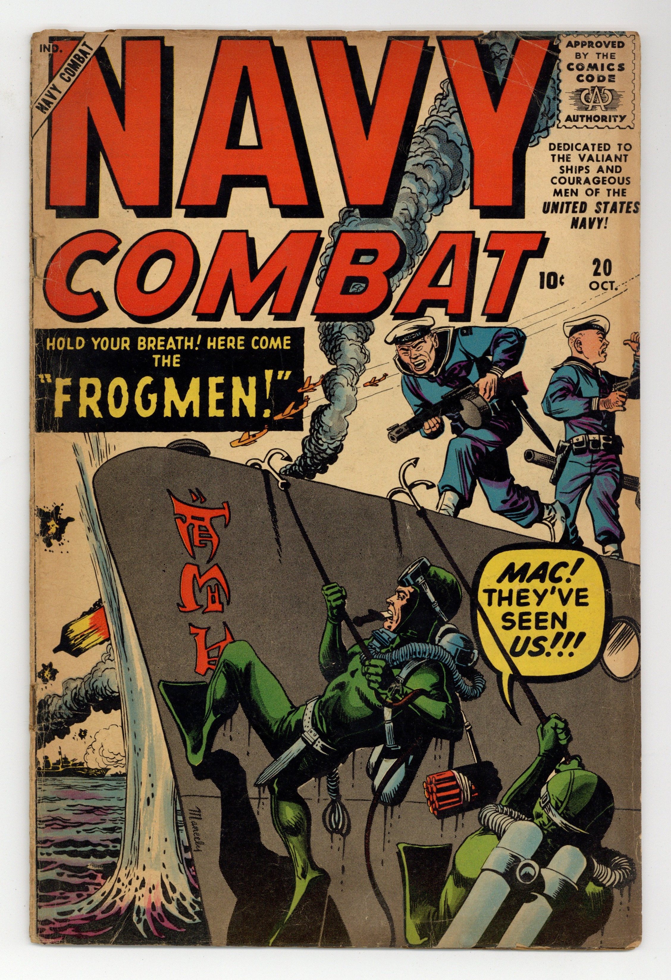 Final issue of the series. "Shakedown!" (art by Bill Everett), "Frogman" (art by Richard Doxsee), "The Sinking Ship" (art by John Forte), "Night Strike" (art by Bob Powell), "S.O.S. Torpedo" (art by Paul Reinman), and a two-page text story, "The Sun Victory." Joe Maneely cover. Cover price $0.10.