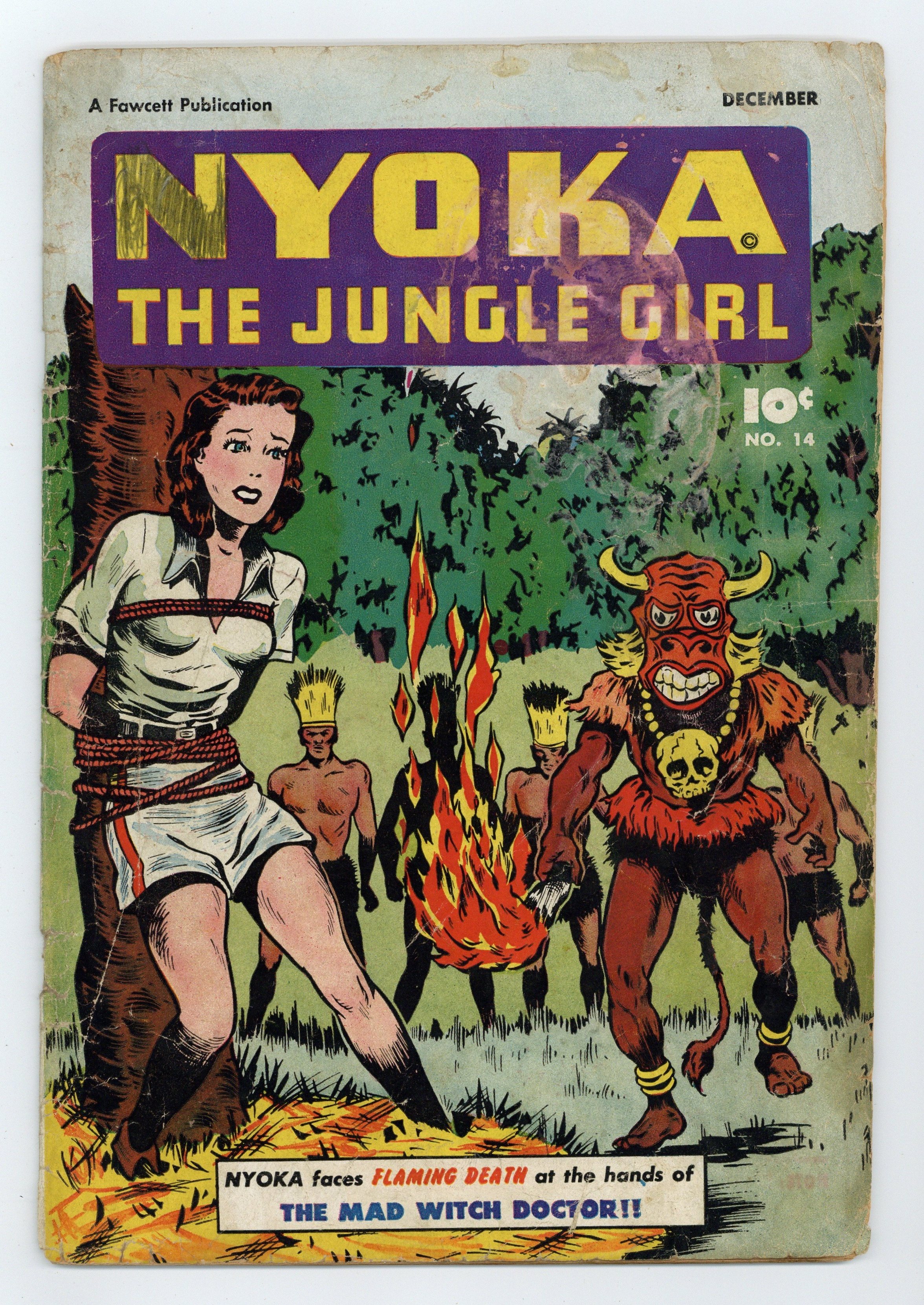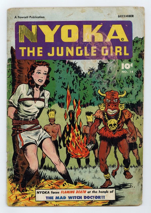 Cover by Bert Whitman. Stories and art by Bernie Krigstein and Howard Boughner. Raised in the jungle by her scientist father, Nyoka faces its dangers like no man ever could. In a three-part story featuring early art by future EC legend Bernie Krigstein, Nyoka realizes that a deadly plague is loose in the native population. But a shaman is threatened by the arrival of modern medicine, so he has Nyoka and Dr. Thompson attacked on their way into the jungle with the vaccine. The Witch Doctor's Madness! Part I: The Jungle Epidemic; Trader Tom; Boy Scout Bob; Muscle Hedd; Part 2: The Lajos Cure; Whipper Snappers; Lion-Hearted Leo, the Animal Trainer: The Bear Hunt; The Striped Demon; Part 3: Bewitched; Nyoka's Jungle Quiz. 32 pages, Full Color. Cover price $0.10.