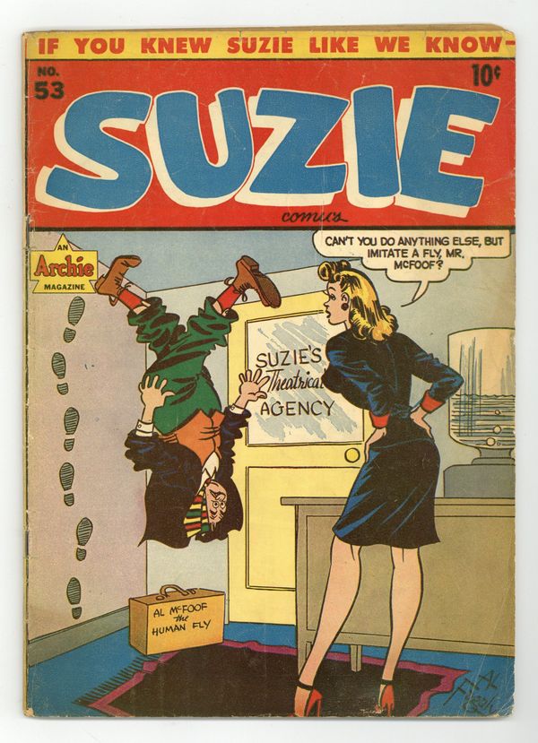 Cover by Al Fagaly. Untitled story, art by Al Fagaly; When Suzie's grandfather comes for a visit, she prepares to care for a sick old man, but instead finds he's a jive talker with an appetite for carnivals, boxing, and the jitterbug. Suzie Puzzle Page. Untitled story, art by Al Fagaly; Suzie's mischievous niece Angela comes for a visit and goes to the park with Suzie. Suzie's Movie Diary article. Untitled story, art by Al Fagaly; Suzie gets roped into babysitting an elephant for a circus performer. "Meet Taffy - She's Terrif!", script and art by Bill Woggon; Taffy dresses up for the new history teacher, who is heard to resemble a handsome actor, only to find that he is attracted to "primitive women" that don't wear makeup or fancy clothes. "Suzie Goes West!", script and art by Bill Woggon; Suzie goes to work on Don's Dude Ranch, where she wears chaps in underwear and puts a corset on a horse. 52 pgs., full color. Cover price $0.10.