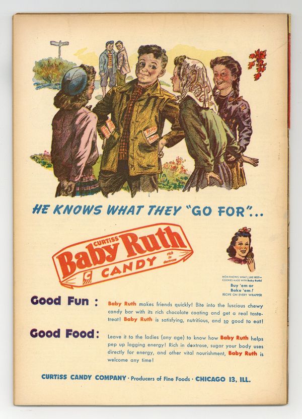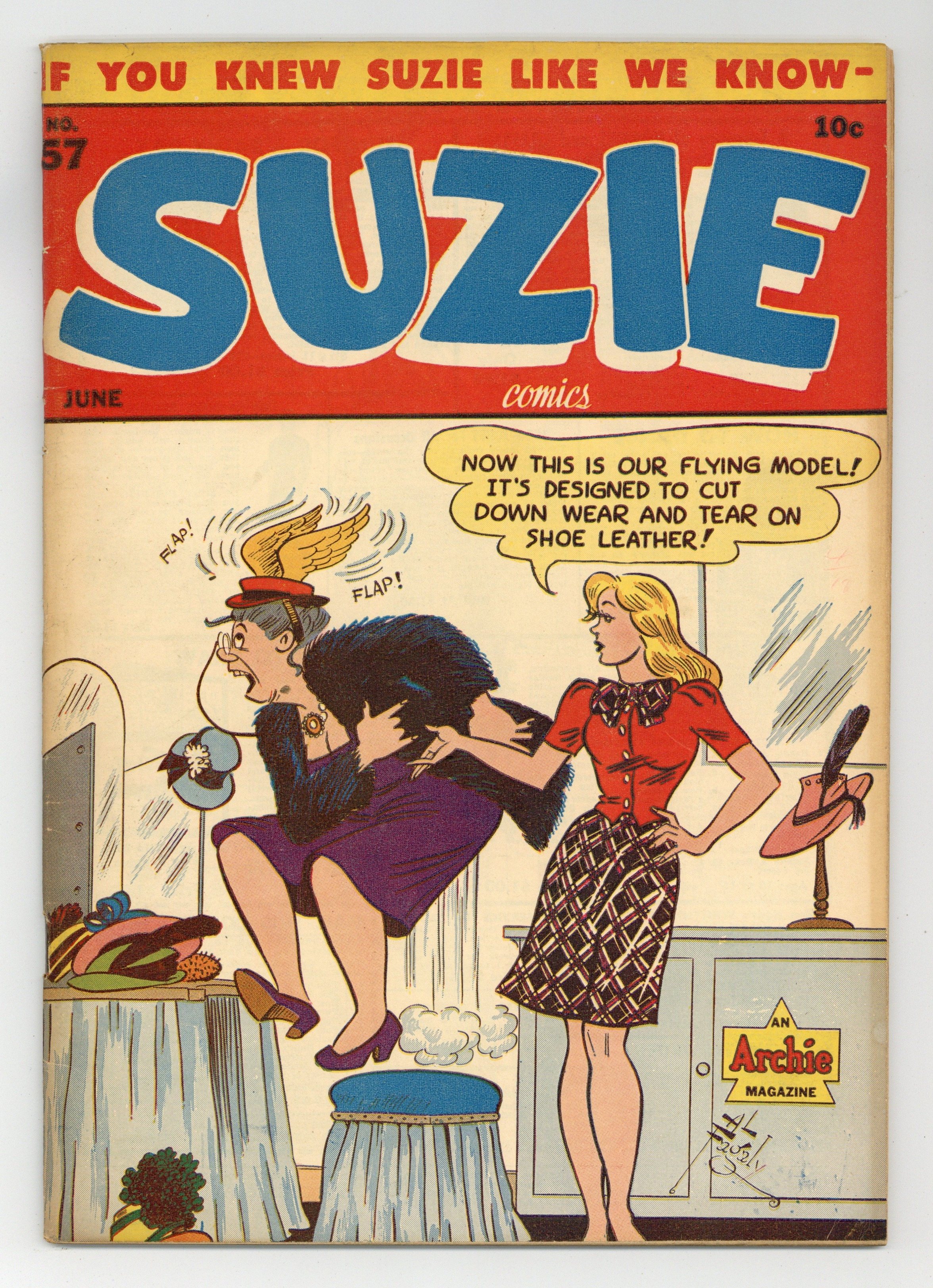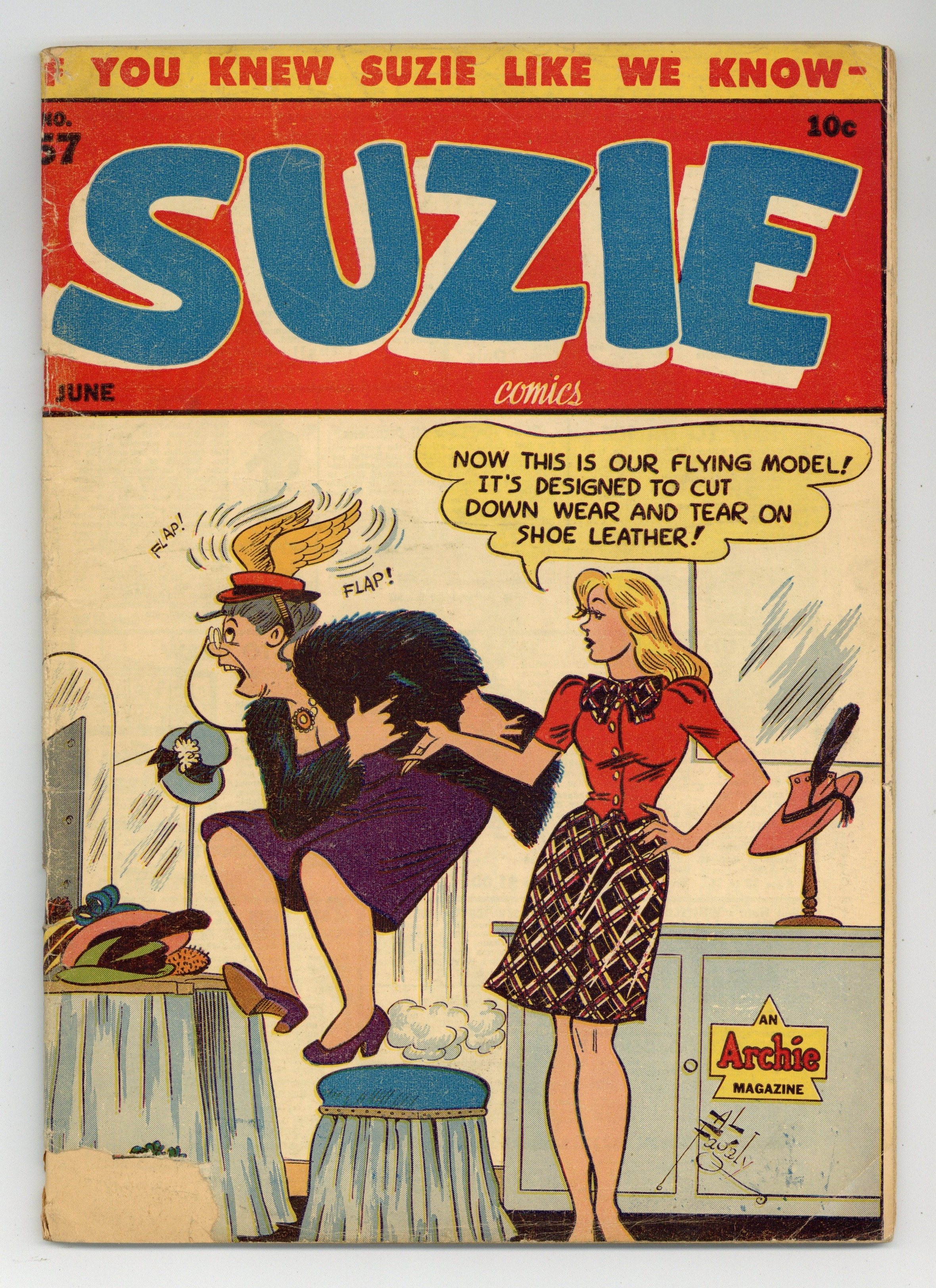 Cover by Al Fagaly. Untitled story; Suzie has her mischievous niece Angela take pin-up pictures at the beach. Pep Comics ad. Suzie's Snappy Swim Suits page by Al Fagaly. Untitled story; Suzie dreams that suicidal director J.A. Panick casts her in his movie as Juliet alongside Cary Grant. Super Duck ad. Untitled story; Suzie takes her niece Angela to the park, where Angela causes trouble. Suzie Puzzle Page by Herbert "Red" Holmdale. Untitled story, script and art by Bill Woggon; Dr. Kildear gets a new camera and decides to take pin-up photos of Katy. Suzie's Movie Diary article. "Suzie's Baby Sitter Bureau"; Suzie opens a babysitting firm and babysits for the McFoofs. Untitled story; Suzie accidentally gets drafted onto her boss's all-girls' baseball team. 52 pgs., full color. Cover price $0.10.