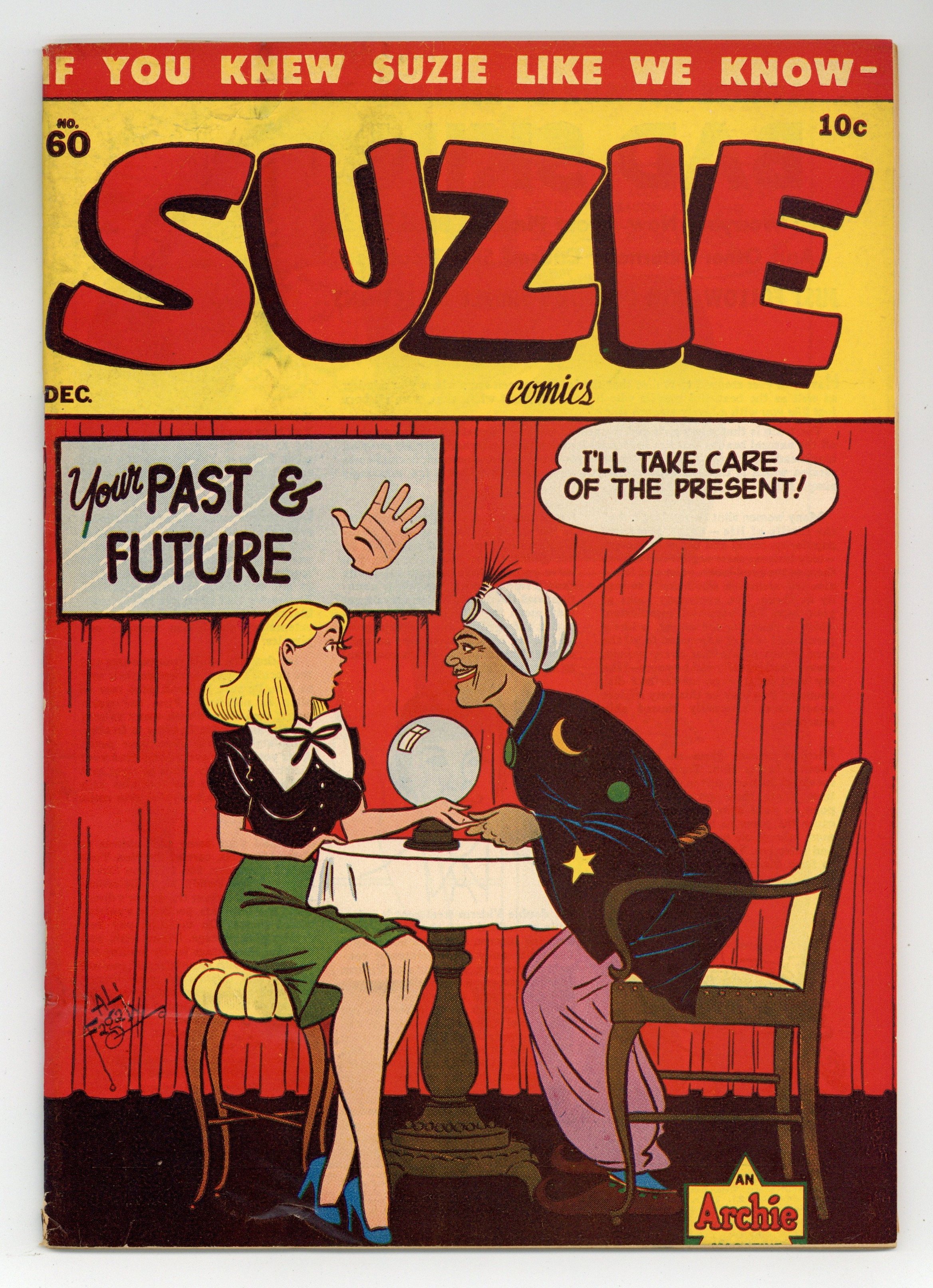 Cover by Al Fagaly. "Suzie Fashion Department"; Suzie shows the Postman why she receives so much mail. Suzie Puzzle Page. "Oh What a Beautiful Morning"; Suzie and her date participate on the Sudsy Wudsy Quiz program. Swift's Premium Franks ad with Archie. "Howdy, Suzie!"; Suzie and Ferdie go to work on a dude ranch. Suzie's Movie Diary text story. "Happy Birthday Katy Keene," art by Bill Woggon; Sis gets a birthday present for Katy, but eats the whole thing before giving it to her. "Gee! I Hope I Can Get That Job I Applied For!" Suzie poses for a comic book artist. Laugh Comics ad. 52 pgs., full color. Cover price $0.10.
