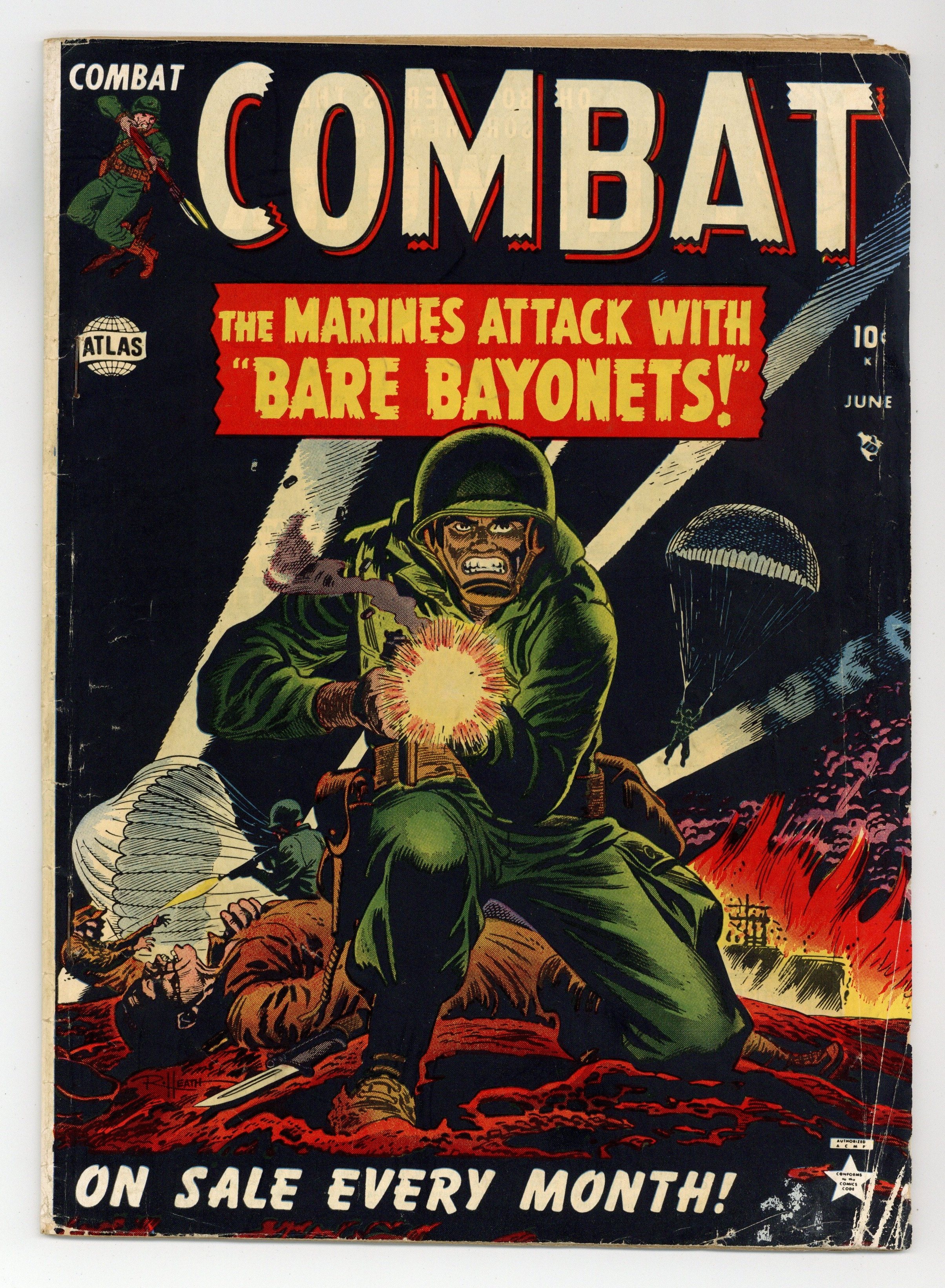Edited by Stan Lee. Cover by Russ Heath. Stories by Hank Chapman and unknown. Art by Joe Maneely, Paul Reinman, Mac L. Pakula and unknown. In this issue: "The Glory of an Infantryman" by Hank Chapman and Joe Maneely; 2-page text story "To the Death"; "Four Men" by Hank Chapman and Paul Reinman; the Marines attack with..."Bare Bayonets" with art by Mac L. Pakula; and "Hit the Silk" with story by Hank Chapman. 32 pages, full color. Cover price $0.10.