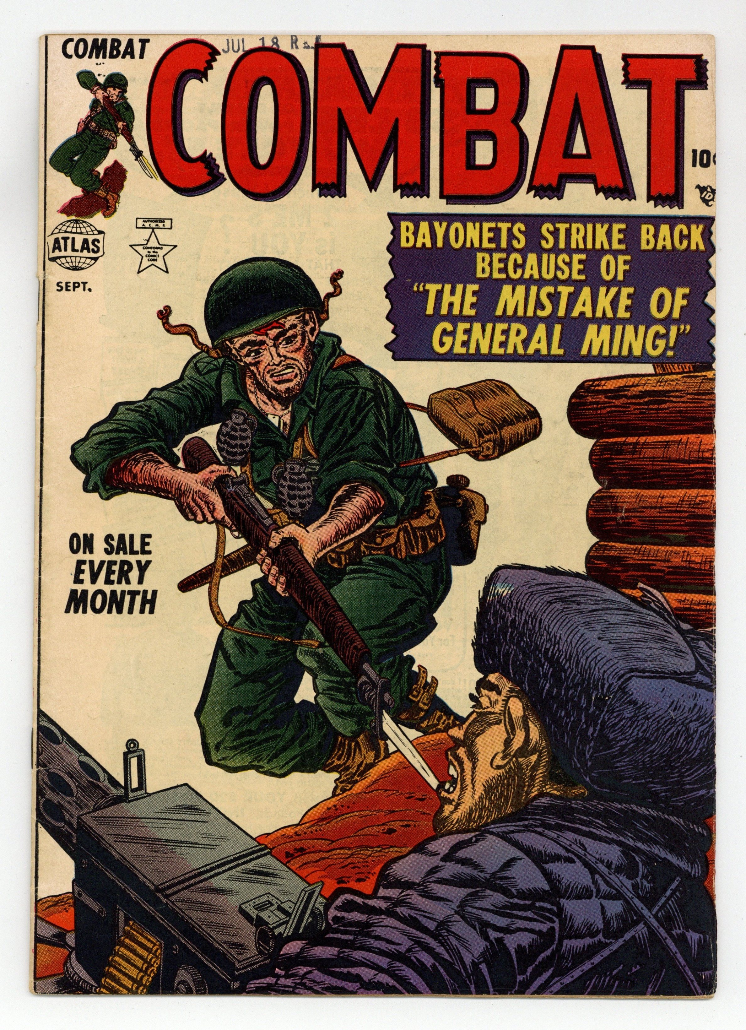 Edited by Stan Lee. Stories by Stan Lee, Hank Chapman and unknown. Art by Joe Sinnott, Fred Kida, Bernie Krigstein, Cal Massey and unknown. In this issue: "Breakout!" with art by Joe Sinnott; bayonets strike back because of..."The Mistake of General Ming" by Stan Lee and Fred Kida; 2-page article "Easy Escape"; "The Tank-Killers" by Hank Chapman and Bernie Krigstein; and "The Impossible Takes a Little Longer" with story by Hank Chapman and pencils by Cal Massey. 32 pages, full color. Cover price $0.10.
