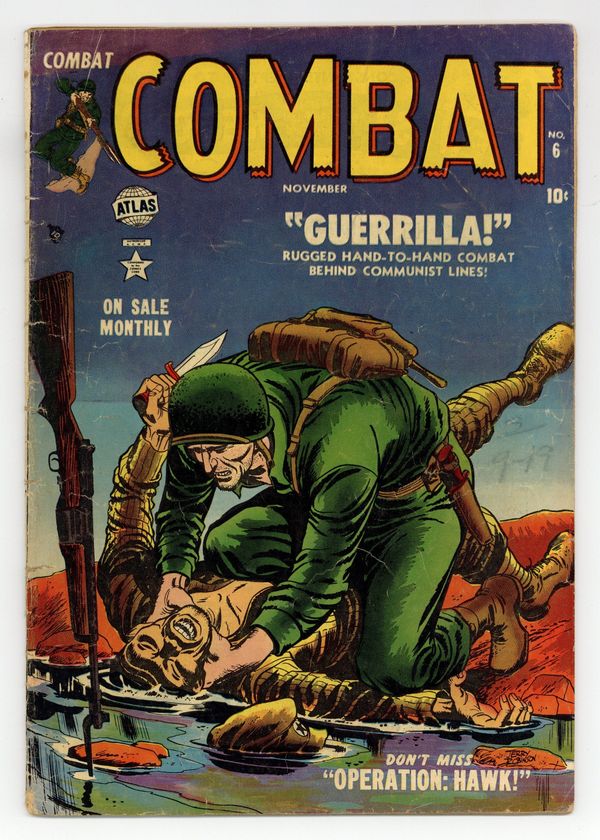 $56.00Edited by Stan Lee. Cover by Jerry Robinson. Stories by Hank Chapman, Carl Wessler and unknown. Art by Robert Q. Sale, Norman Steinberg, John Romita, Joe Sinnott and unknown. In this issue: Rugged hand-to-hand combat behind Communist lines in "Guerrilla!" by Hank Chapman and Robert Q. Sale; "Operation Hawk" with pencils by Norman Steinberg; 2-page article "Military Manicure"; "Stand Fast" with art by John Romita; and "A Medal for Mickey" by Carl Wessler and Joe Sinnott. 32 pages, full color. Cover price $0.10.