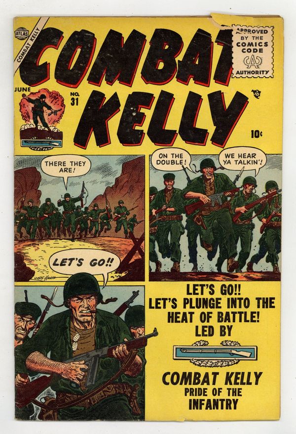 Combat Kelly in "Call Out the Cavalry," "The Wolves," and an untitled story. Back-up: "Cookie's Combat Course: Boom Stuff!" Art on all four stories by Dave Berg. Two-page text story, "Medal For a Sailor." Russ Heath cover. Cover price $0.10.