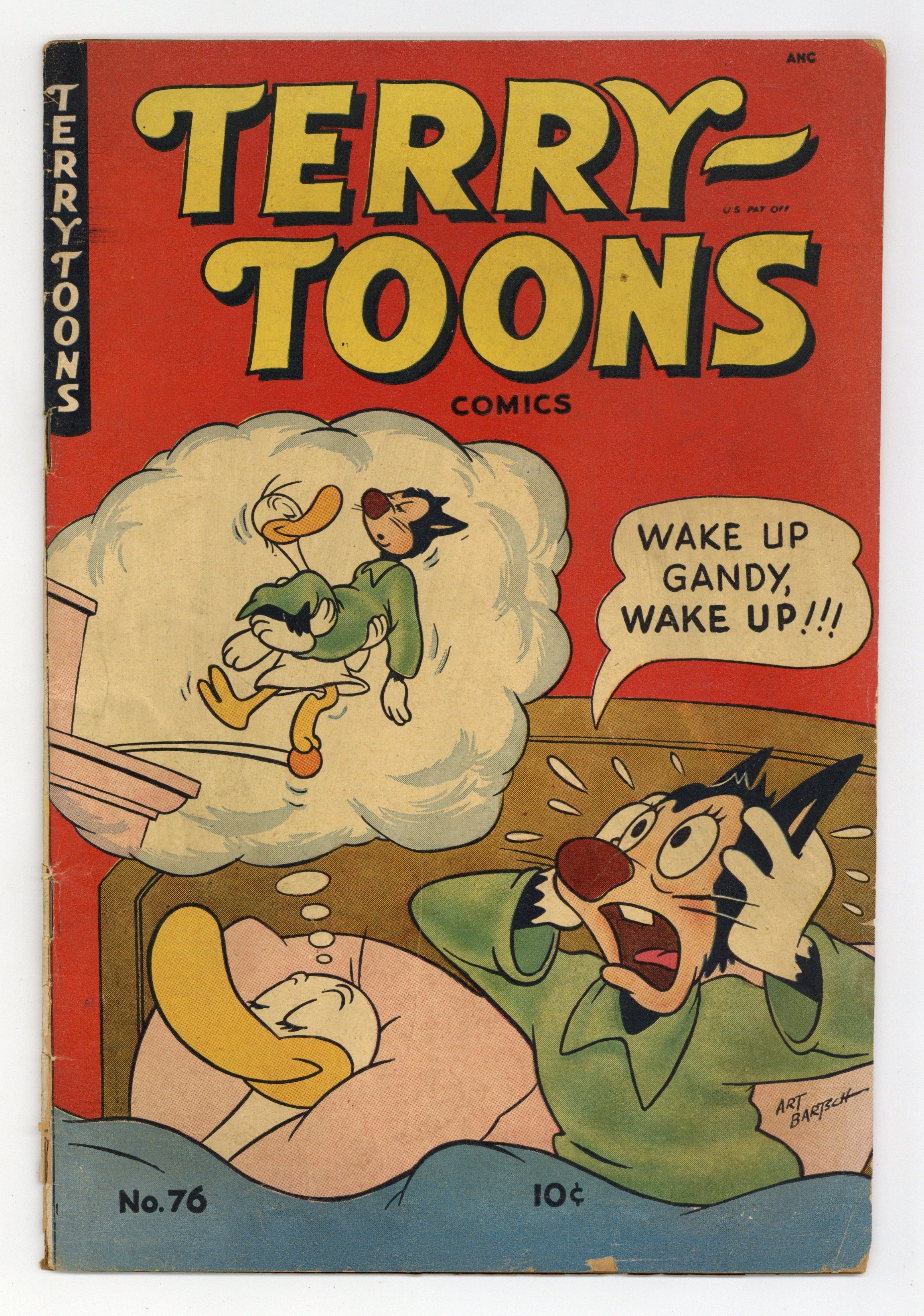 Cover by Art Bartsch. Art by Art Bartsch, Jim Tyer and Connie Rasinski. St. John presents the comics adventures of the characters of animator Paul Terry's studio. Mighty Mouse's foe The Claw turns mice into mousicles as a treat for cats. Heckle and Jeckle set out to get the reward for catching a jewel thief, using Dopey Dog as bait. Sourpuss and Gandy Goose find themselves adrift at sea. Sourpuss: Hokey Hero; Mighty Mouse: The Deep Freeze Gang; Gandy Goose: Amateur Doctor; Dinky: Butting Billy; Heckle and Jeckle: The Eye of India; Gandy Goose: Fools Afloat. 32 pages, Full Color. Cover price $0.10.