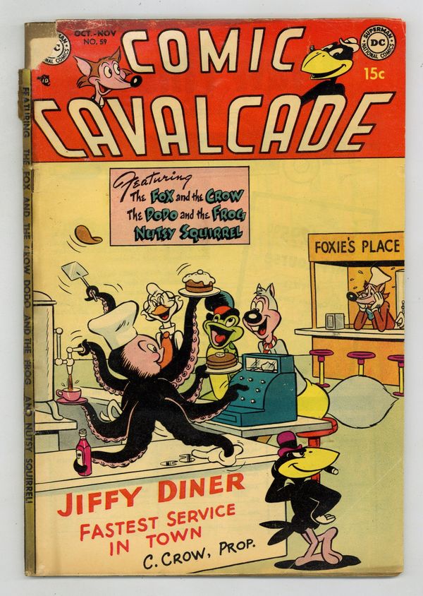 "House to House" starring Fox and Crow, script by Hubie Karp, art by Jim Davis; Crawford convinces Fauntleroy that it would be less work to live in his tree, so they swap dwellings. "Oil's Well" starring Nutsy Squirrel, art by Rube Grossman; Nutsy finds an oil can and searches for things to use it on. "Friday the 13th" starring Dodo and the Frog, art by Otto Feuer. "Who's You Tailor?" starring Bo Bunny, script and art by Sheldon Mayer. "Tricky Trading" starring Doodles Duck, script and art by Sheldon Mayer. "It sure is hot today!" starring Goofy Goose, art by Rube Grossman. "Farmer Brown's New Watchdog" starring Pinky and Winky, art by Rube Grossman. "Misery! Misery! Suffer, suffer, suffer--!" starring Nip and Chip, art by Otto Feuer. Robin Could starring Tortoise and the Hare, art by Rube Grossman. 68 Pages, Full Color. Cover price $0.15.