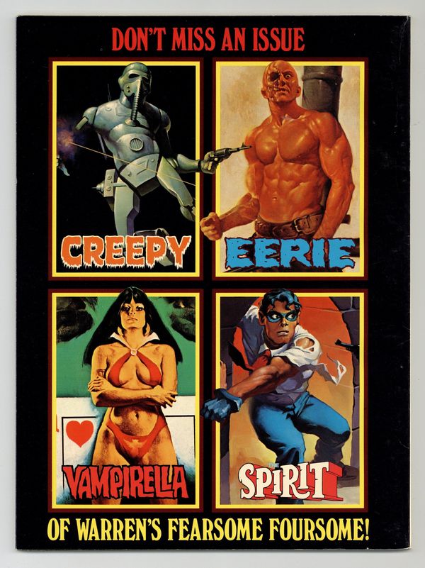 $27.00Richard Corben, Berni Wrightson, Reed Crandall, Wally Wood, Esteban Maroto, and others. Comix International was a short-lived magazine comprised entirely of reprinted material (in color) from other Warren publications. Stories in this issue include: The Raven by Richard Corben (from the poem by Edgar Allan Poe); Anti-Christmas by Budd Lewis and Richard Corben; The Butcher: Forgive us our Trespasses by Bill DuBay and Richard Corben; Dracula: The Circus of King Carnival by Gerry Boudreau and Esteban Maroto; Dracula: The Winged Shaft of Fate by Gerry Boudreau and Esteban Maroto; The Manhunters by Gerry Boudreau and Wally Wood; Purge! by Bruce Bezaire and Jose Ortiz; Janis! by Victor Mora and Luis Garcia; The Beast on Bacon Street by Budd Lewis and Reed Crandall; and The Muck Monster by Bernie Wrightson. Also includes artist profiles of Richard Corben, Reed Crandall, Wally Wood, Bernie Wrightson, and others. Cover depicts a montage of interior panels.