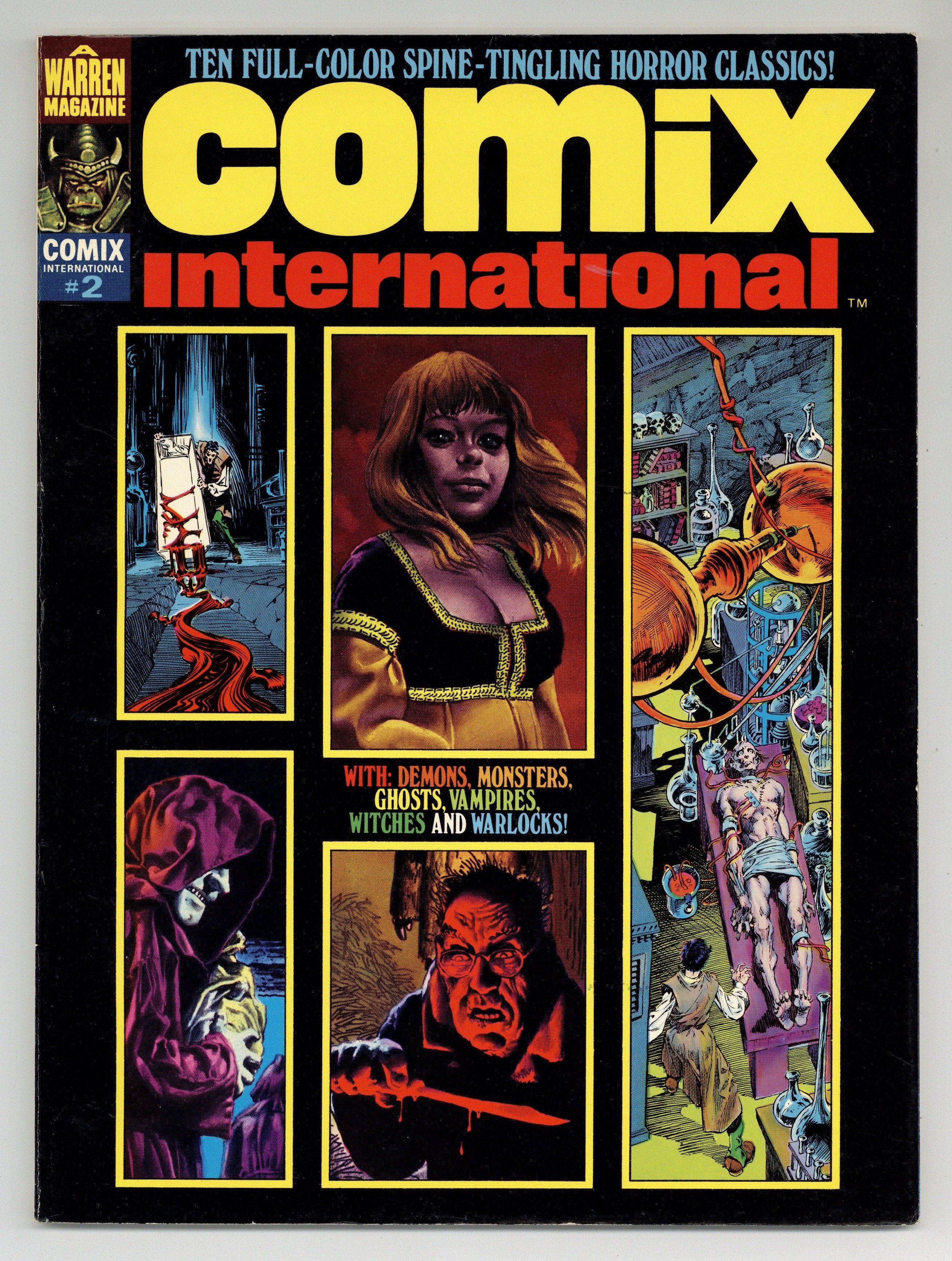 Richard Corben, Berni Wrightson, Reed Crandall, Wally Wood, Esteban Maroto, and others. Comix International was a short-lived magazine comprised entirely of reprinted material (in color) from other Warren publications. Stories in this issue include: The Raven by Richard Corben (from the poem by Edgar Allan Poe); Anti-Christmas by Budd Lewis and Richard Corben; The Butcher: Forgive us our Trespasses by Bill DuBay and Richard Corben; Dracula: The Circus of King Carnival by Gerry Boudreau and Esteban Maroto; Dracula: The Winged Shaft of Fate by Gerry Boudreau and Esteban Maroto; The Manhunters by Gerry Boudreau and Wally Wood; Purge! by Bruce Bezaire and Jose Ortiz; Janis! by Victor Mora and Luis Garcia; The Beast on Bacon Street by Budd Lewis and Reed Crandall; and The Muck Monster by Bernie Wrightson. Also includes artist profiles of Richard Corben, Reed Crandall, Wally Wood, Bernie Wrightson, and others. Cover depicts a montage of interior panels.