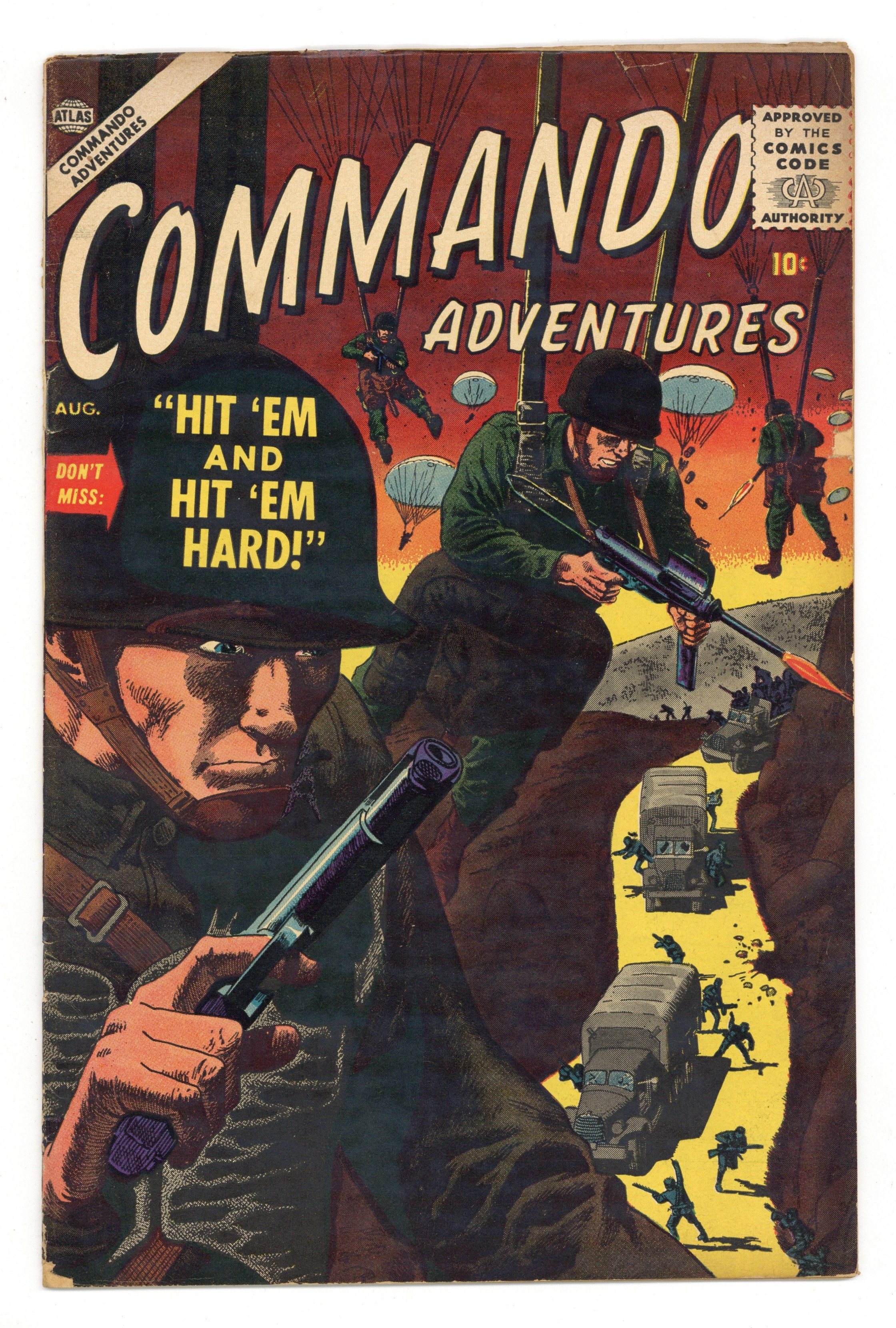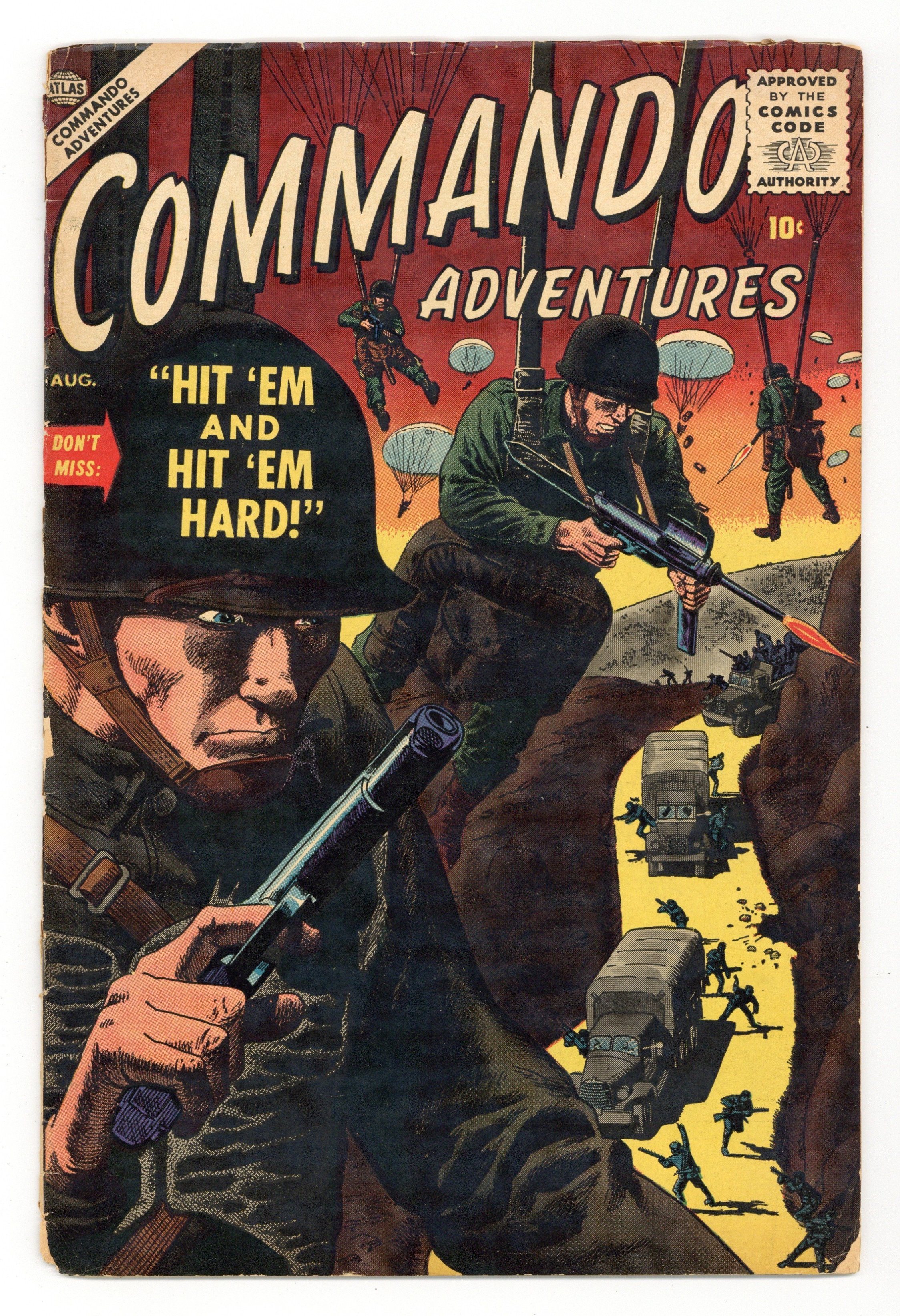 Final issue of the series. "Hit 'Em--an' Hit 'Em Hard" (art by Gene Colan), "Wall of Fire," "The Fight For Freedom," "Behind Enemy Lines," "Secret Tower" (art by John Romita Sr.), and a two-page text story, "Leap To Glory." (No Mort Drucker art.) John Severin cover. Cover price $0.10.