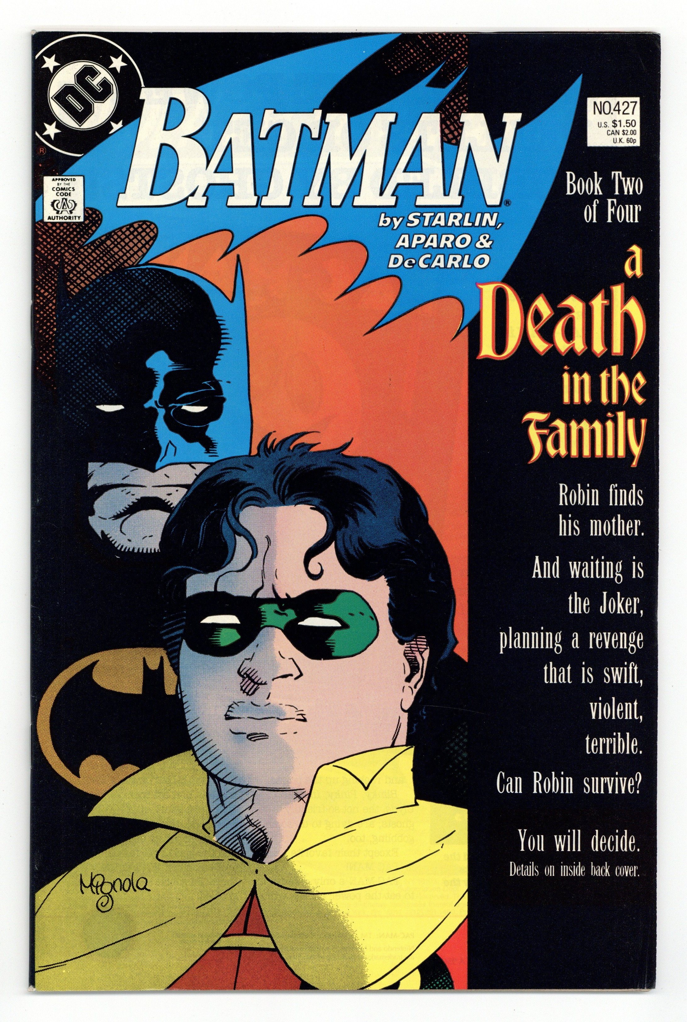 $23.50First printing. Direct Edition. Cover art by Mike Mignola. "A Death in the Family" part 2 of 4, script by Jim Starlin, pencils by Jim Aparo, inks by Mike DeCarlo; Jason meets his real mother, Sheila Haywood, but she turns out to be working for the Joker and allows her son to fall into his deadly hands inside of a warehouse; Joker beats Robin with a crowbar and leaves him for dead as a badly beaten Robin attempts to save his mom and himself from the dynamite left behind by the Joker as he leaves them both to a horrible fate; Batman watches in horror as the warehouse containing Jason and Sheila blows up, too late to stop the Joker. Infamous Phone Poll on death or life for Robin (Jason Todd). The Direct Sales copies of this comic, released first, contained a 1-800 phone number to either vote "for" or "against" the death of Jason Todd on the inside back cover. The newsstand copies, released 3 weeks later did not contain the 1-800 number. NOTE: Most issues from 397-432 were reprinted in 1989 and sold in multipacks. These 2nd and 3rd prints have back cover ads dated 1989. 52 Pages, Full Color. Cover price $1.50.