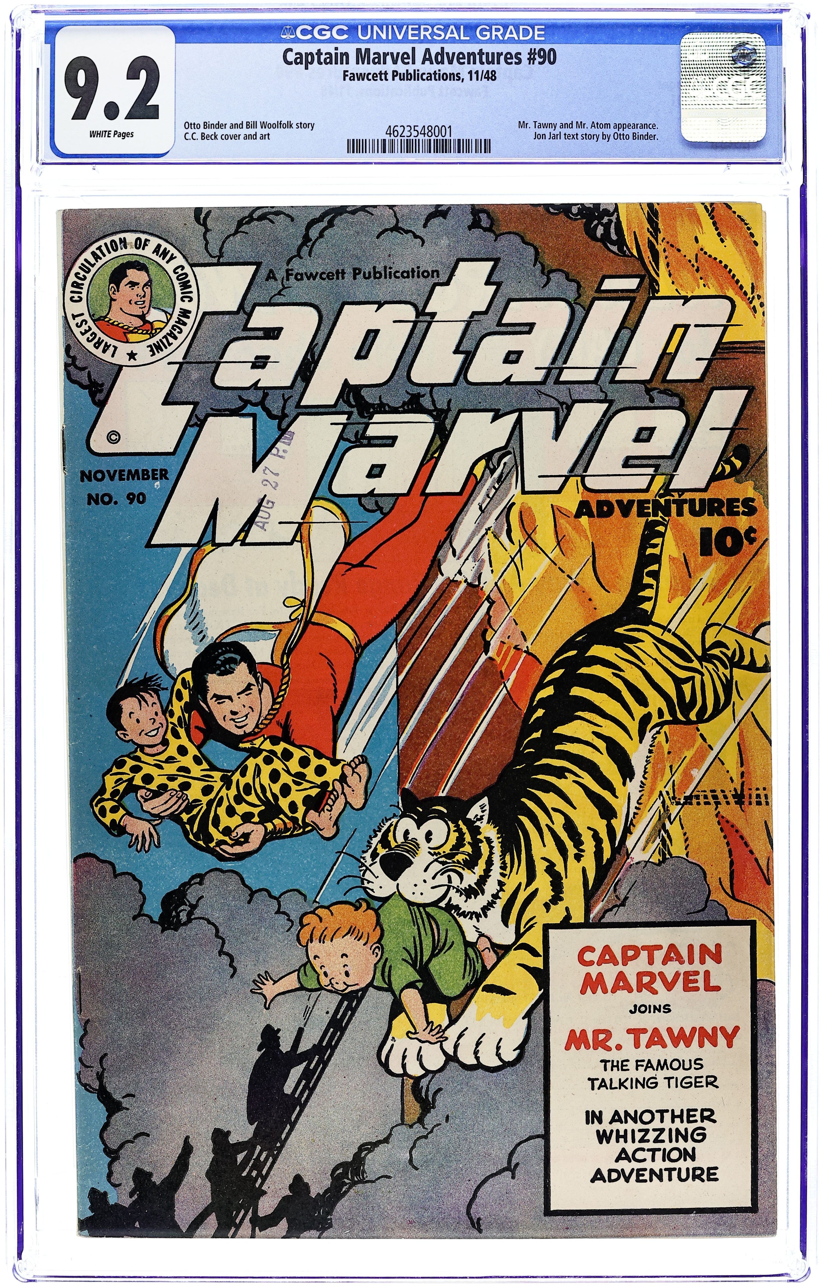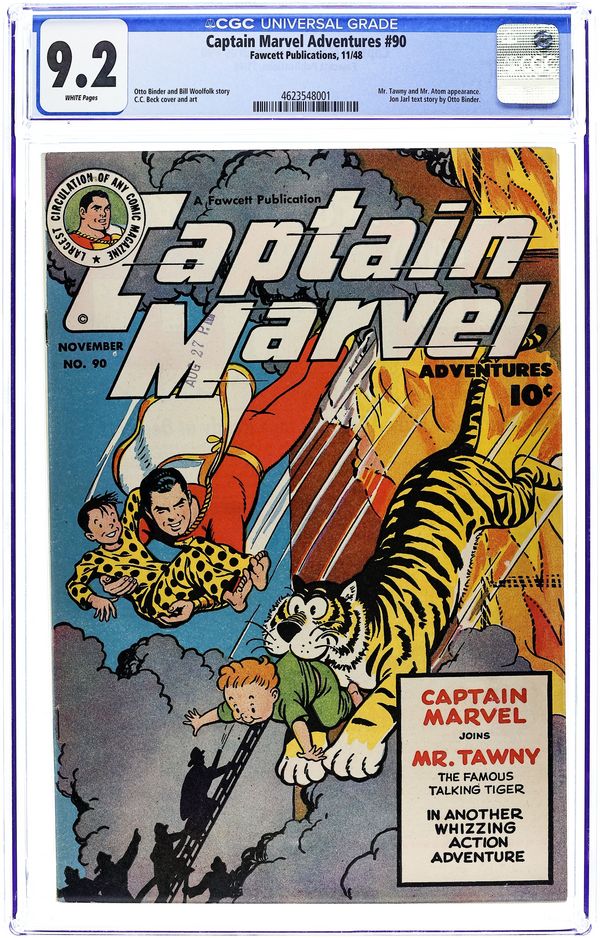 Cover by C.C. Beck. Stories by Bill Woolfolk, Otto Binder and unknown. Art by C.C. Beck, Al Liederman and unknown. Captain Marvel joins Tawky Tawny in another whizzing action adventure in "Mr. Tawny's New Home" by Otto Binder and C.C. Beck. Also in this issue: "The Hand of Captain Marvel" with story by Bill Woolfolk; "Captain Marvel on Exhibit!" with story by Otto Binder; and "The World of Mr. Atom" with story by Bill Woolfolk and pencils by C.C. Beck. Plus: Captain Kid in "The Lost Golf Ball" with art by Al Liederman. And: Jon Jarl in the 2-page text story "Mystery World" by Otto Binder (as Eando Binder). 52 Pages, Full Color. Cover price $0.10.