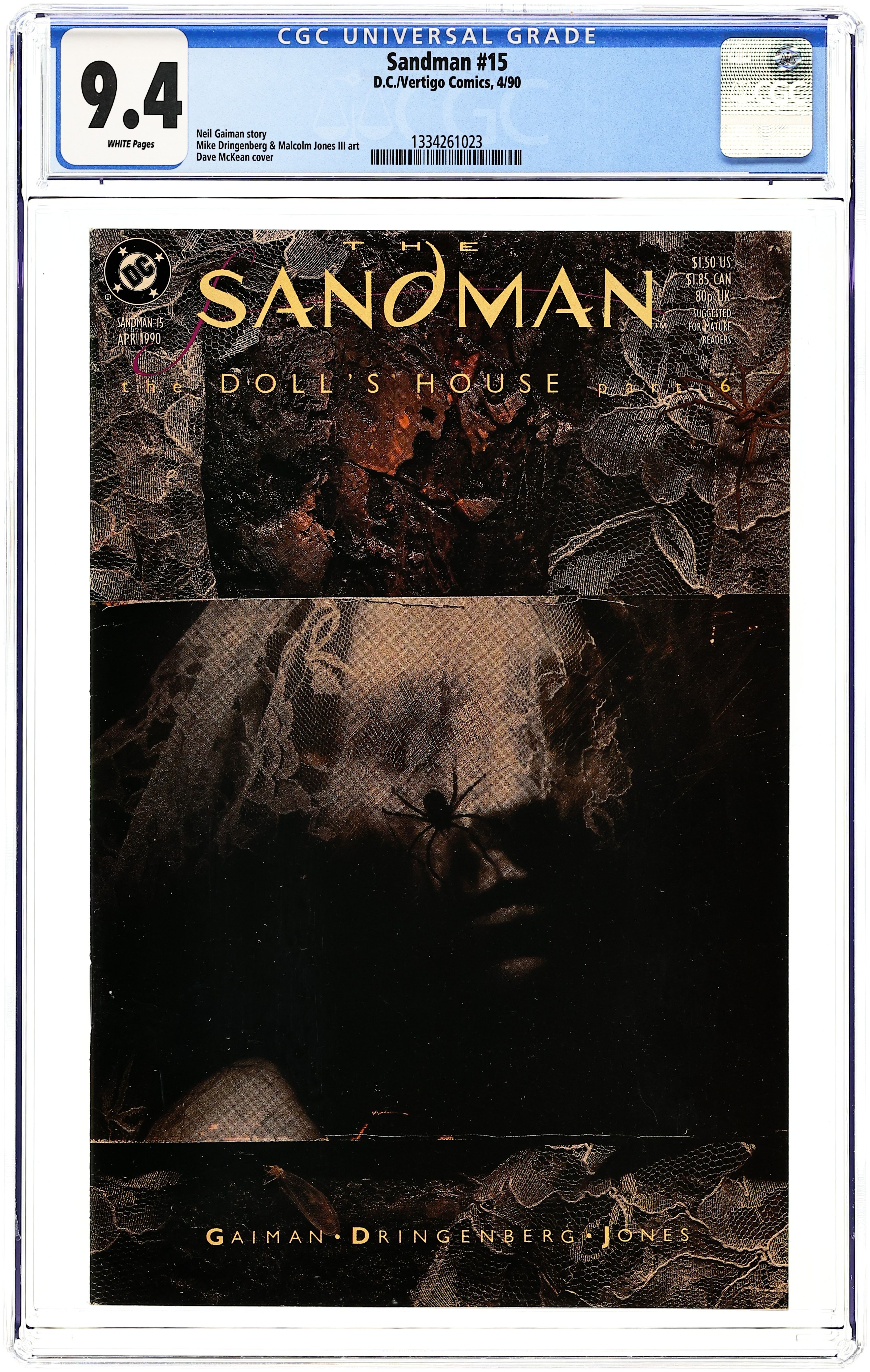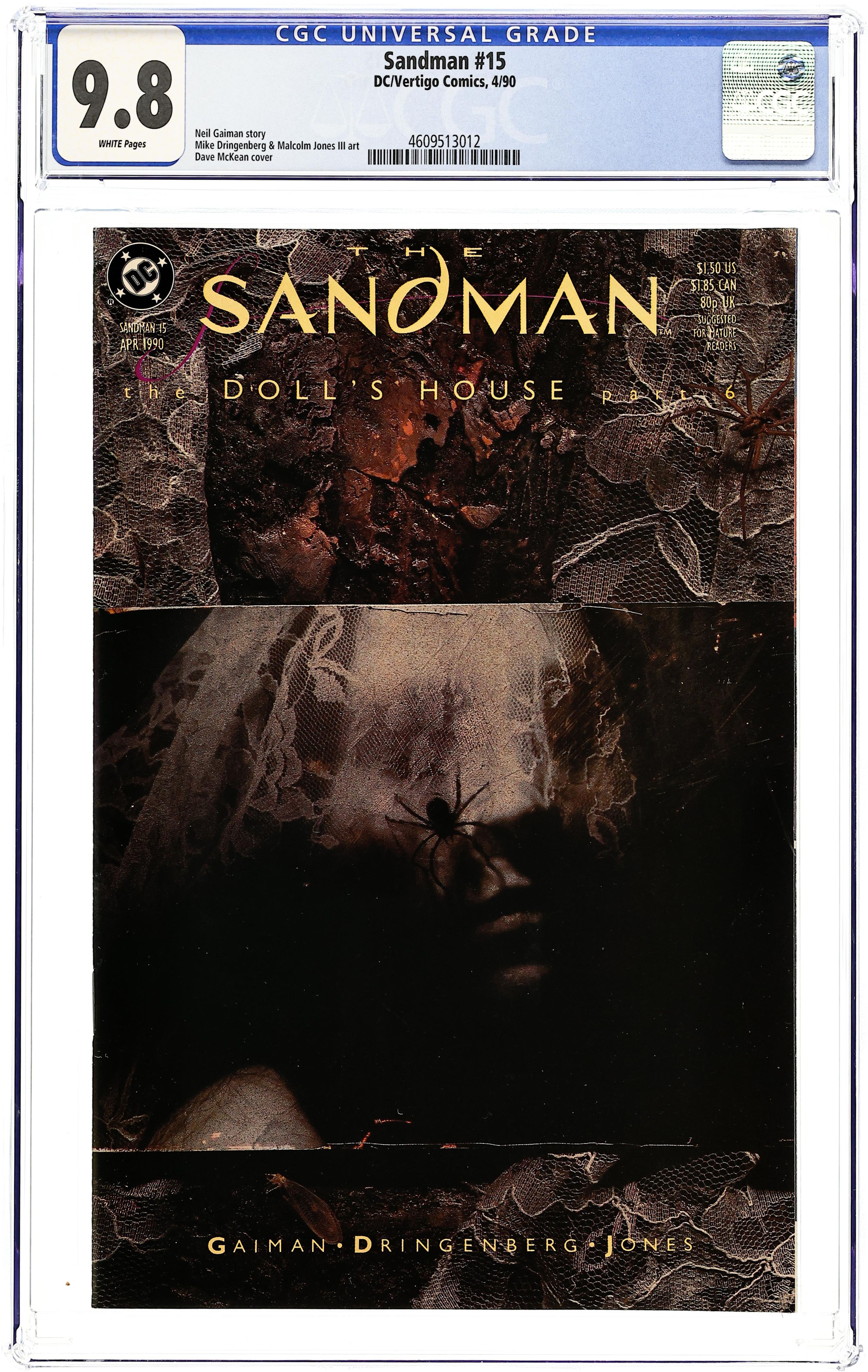 The Doll's House, Part 6 of 7. The secret of the Dream Vortex is revealed as Sandman delves into the dreams of the people trapped in the Doll's House. Written by Neil Gaiman, with art by Mike Dringenberg and Malcolm Jones III. Painted cover by Dave McKean. Suggested for Mature Readers. New Format. Cover price $1.50.