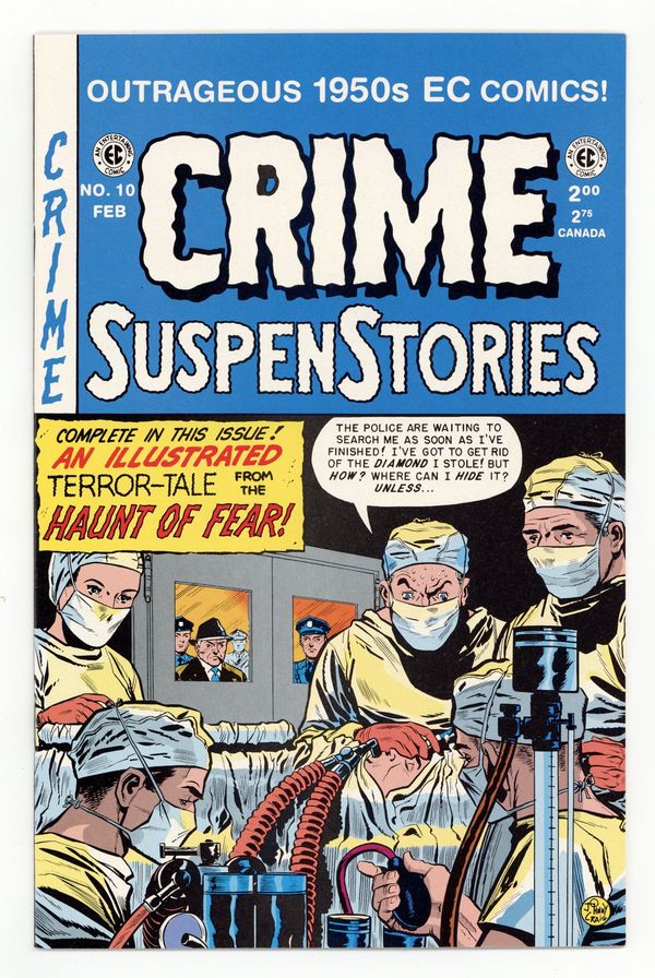 Reprints of classic EC stories. Cover art by Johnny Craig. "Rocks in His Head!", script and art by Johnny Craig; Cynthia shows Charles her new $4000 mink coat and he goes ballistic, not knowing how he can afford such a luxury on his income; He rushes to the hospital and discovers an emergency operation that he is to do, and before he starts to operate, he spots that his lady patient is wearing a valuable diamond ring; he takes it. "Lady Killer," script by Albert B. Feldstein, art by Jack Kamen; Ralph and Jeanne conspire to kill Ralph's wife who refuses to give him a divorce; After making sure he has an air-tight alibi, Ralph sneaks back to his home to shoot his wife, but she is not there; He sits down to wait on her, remembering back to when he first met Jeanne. "Missed by Two Heirs!", script by Albert B. Feldstein, art by Jack Davis; Two stepsons, angry because their late mother willed her fortune to her husband, Henry, instead of to them, decide to kill Henry by loosening the bannister on the spiral staircase leading upstairs, a bannister that Henry leans on every time he descends the stairs. "Friend to 'Our Boys'!", script by Albert B. Feldstein, art by Graham Ingels (as Ghastly); Corporal Tacker arrives home on leave and finds the rented, ramshackle family home teeming with rats and biting insects; When the landlord refuses to correct the conditions of the house, Barry visits the USO, but they can't help either. Fan Club News! The Crypt-Keeper's Page of Fine Arts, script by Russ Cochran, art by Joshua Keene, Hugo Thiry, Michael Craine, and Andy Guitar Player. 36 pgs., full color. Cover price $2.00.