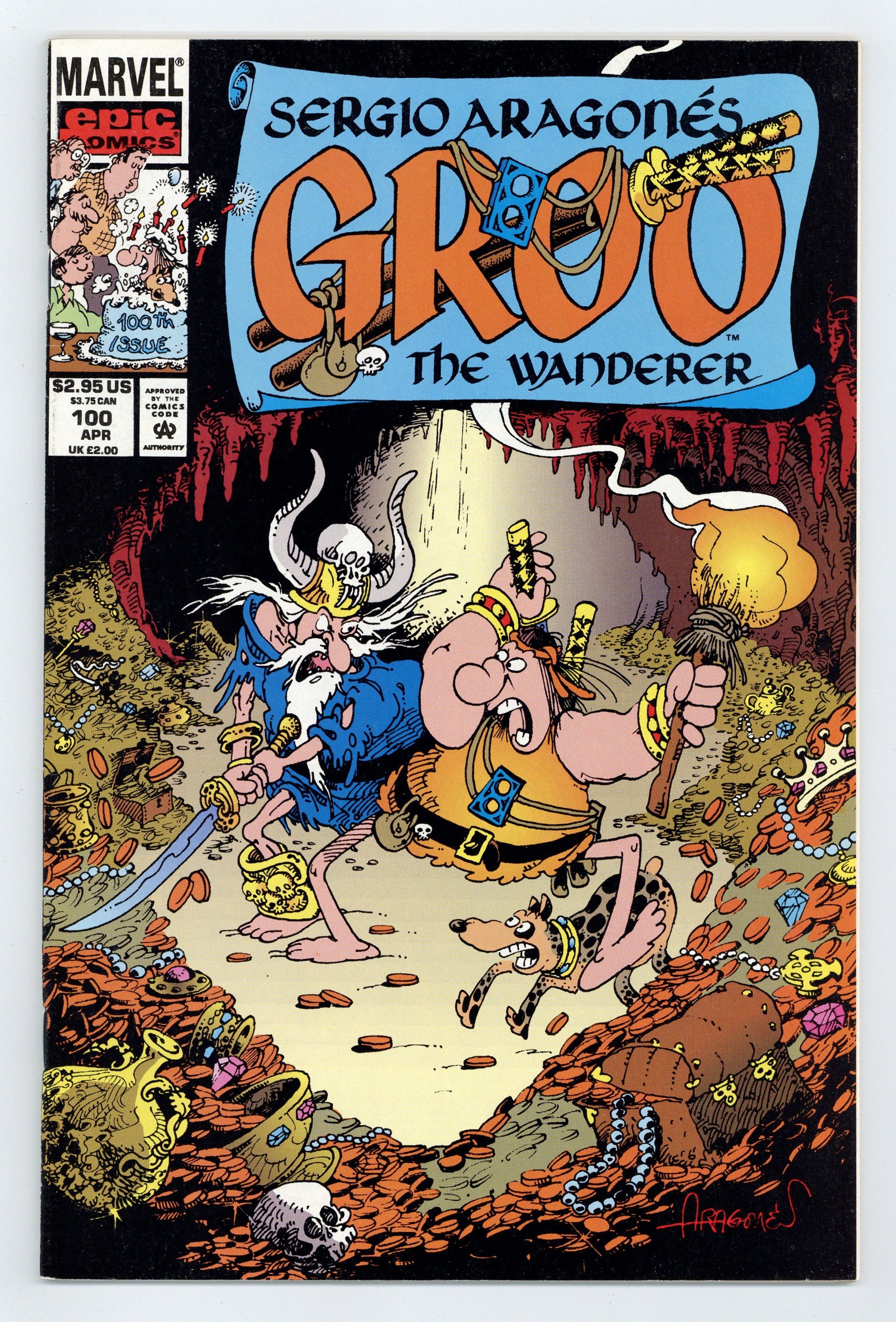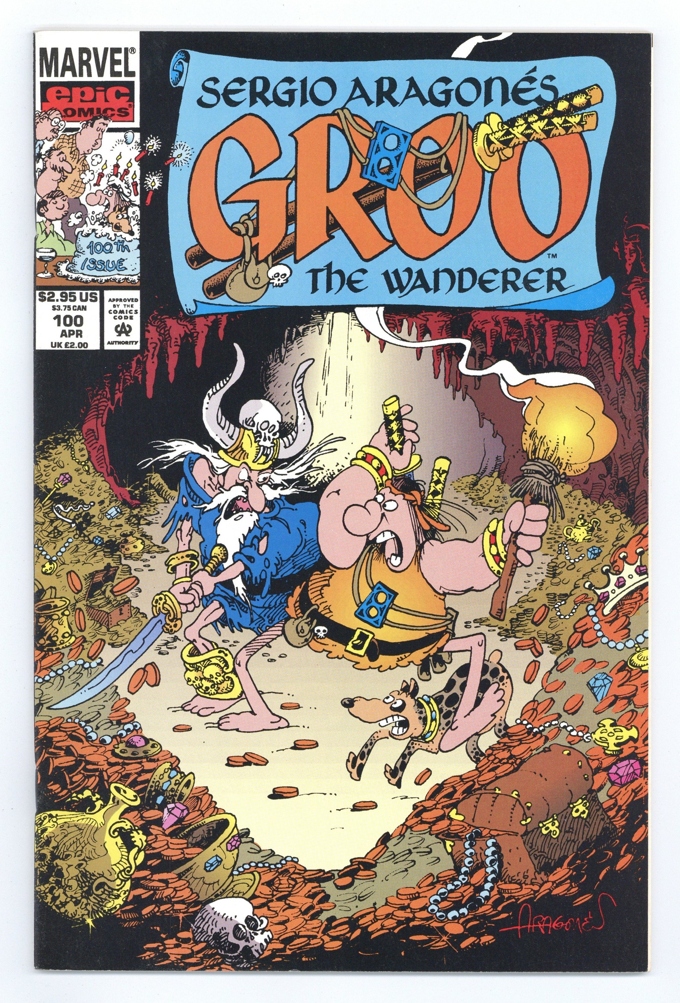$21.0052-page giant. Comic featuring the humorous misadventures of the mighty but not-so-great (mentally) warrior named Groo. Special 100th issue featuring "A Little Knowledge" in which Groo learns to read. Issue also has a puzzle page and a Groo pinup on the back cover. Story and art credits: Sergio Aragonés. Cover price $2.95.