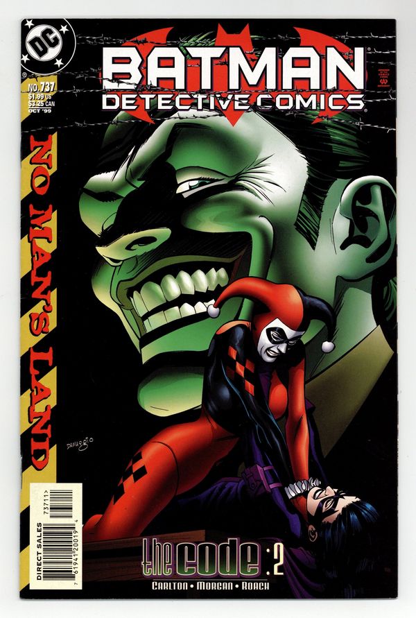 Written by Bronwyn Carlton; art by Tom Morgan and David Roach; cover by Rodolfo Damaggio Harley Quinn, the Joker, and the Huntress face off in "No Man's Land" in the conclusion of "The Code!" While the Joker's political campaign threatens to send the so-called society of "No Man's Land" even further into a state of anarchy, the Huntress and Billy Petit's renegade ex-GCPD band join the fray. But they've never tangled with someone like Harley Quinn, who doesn't appreciate anyone standing between her and her Joker! FC, 40 pgs. $1.99" Batman No Man's Land Cover price $1.99.