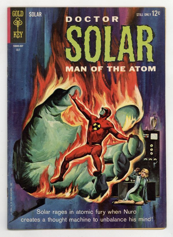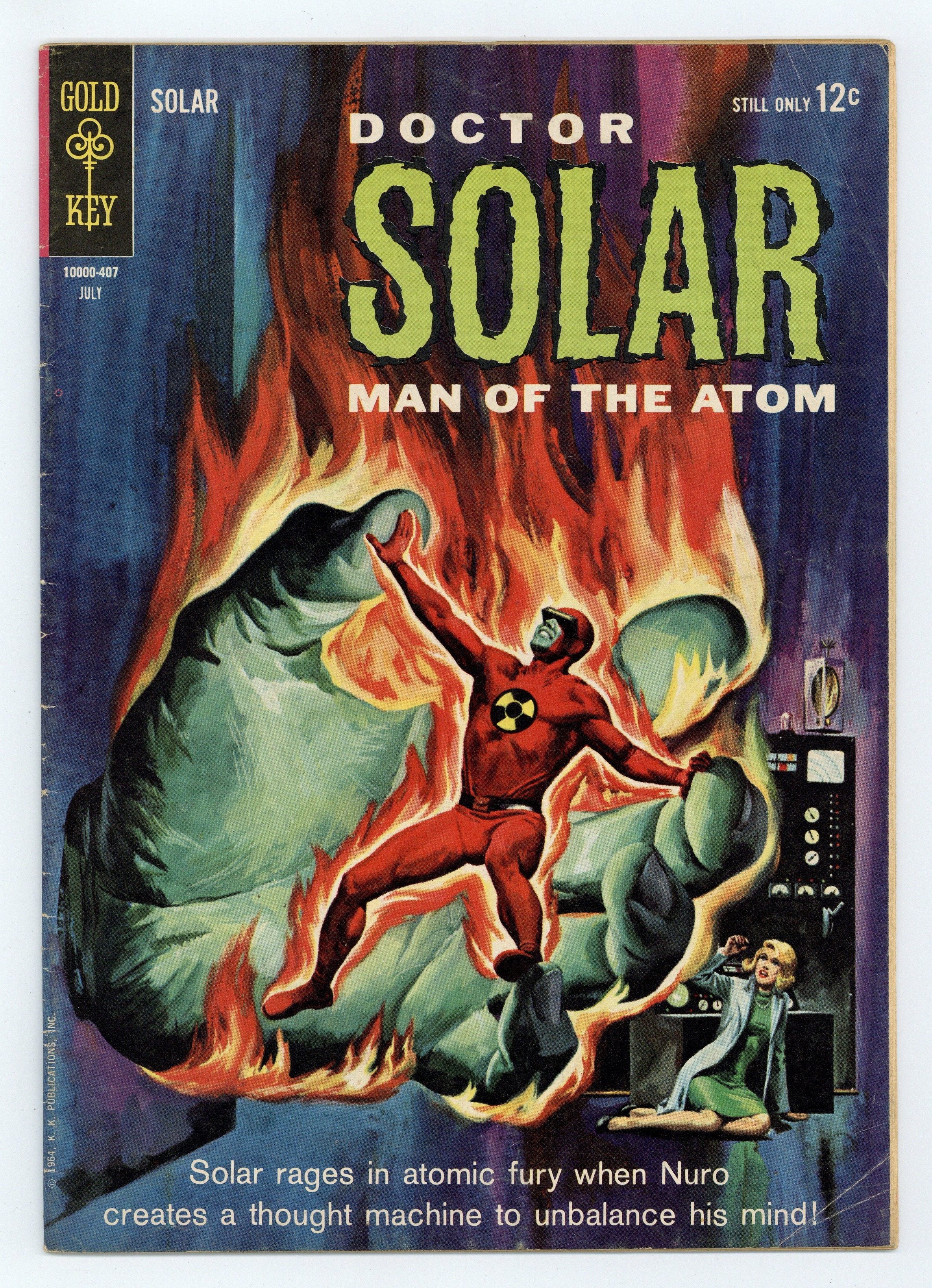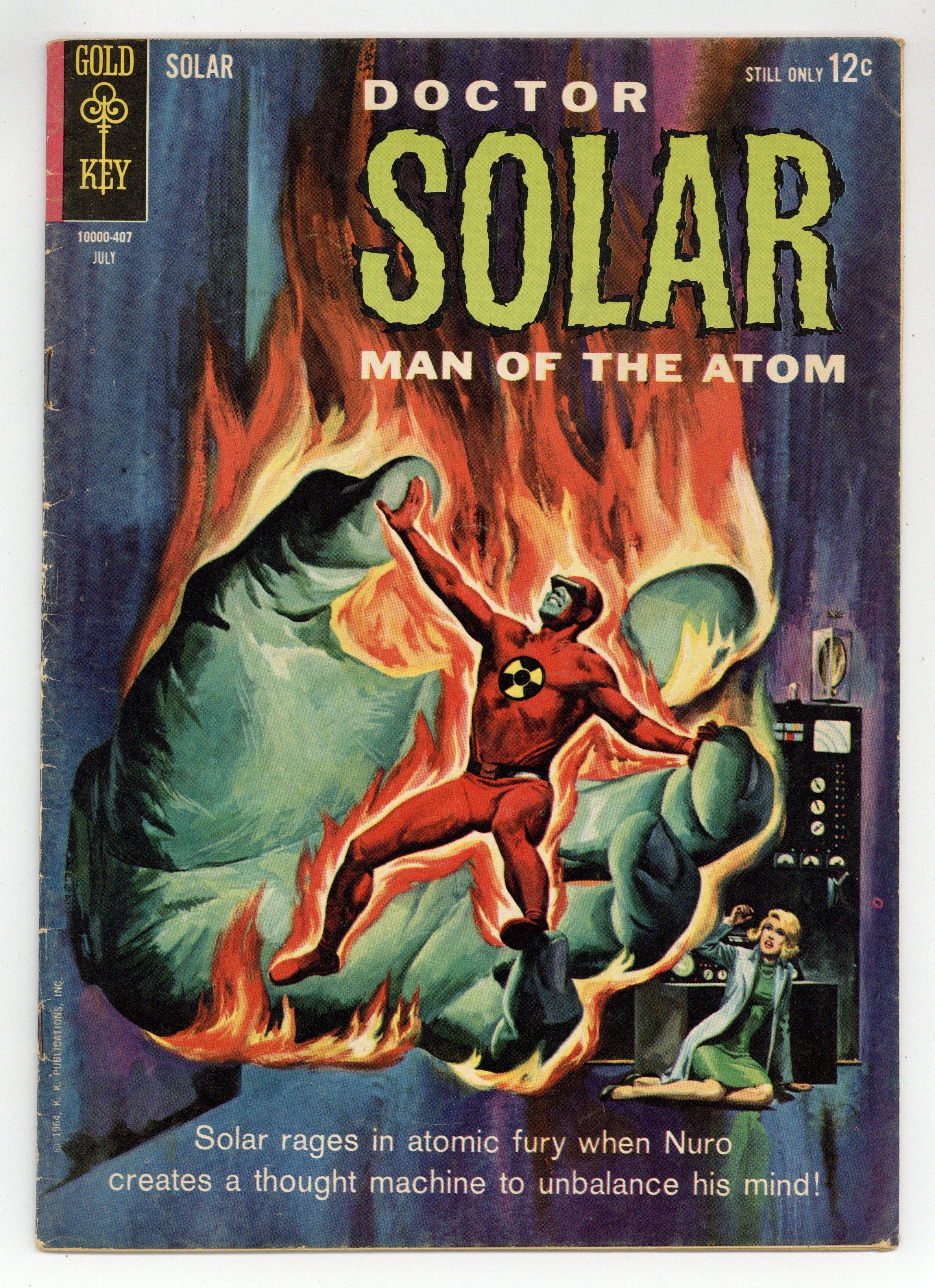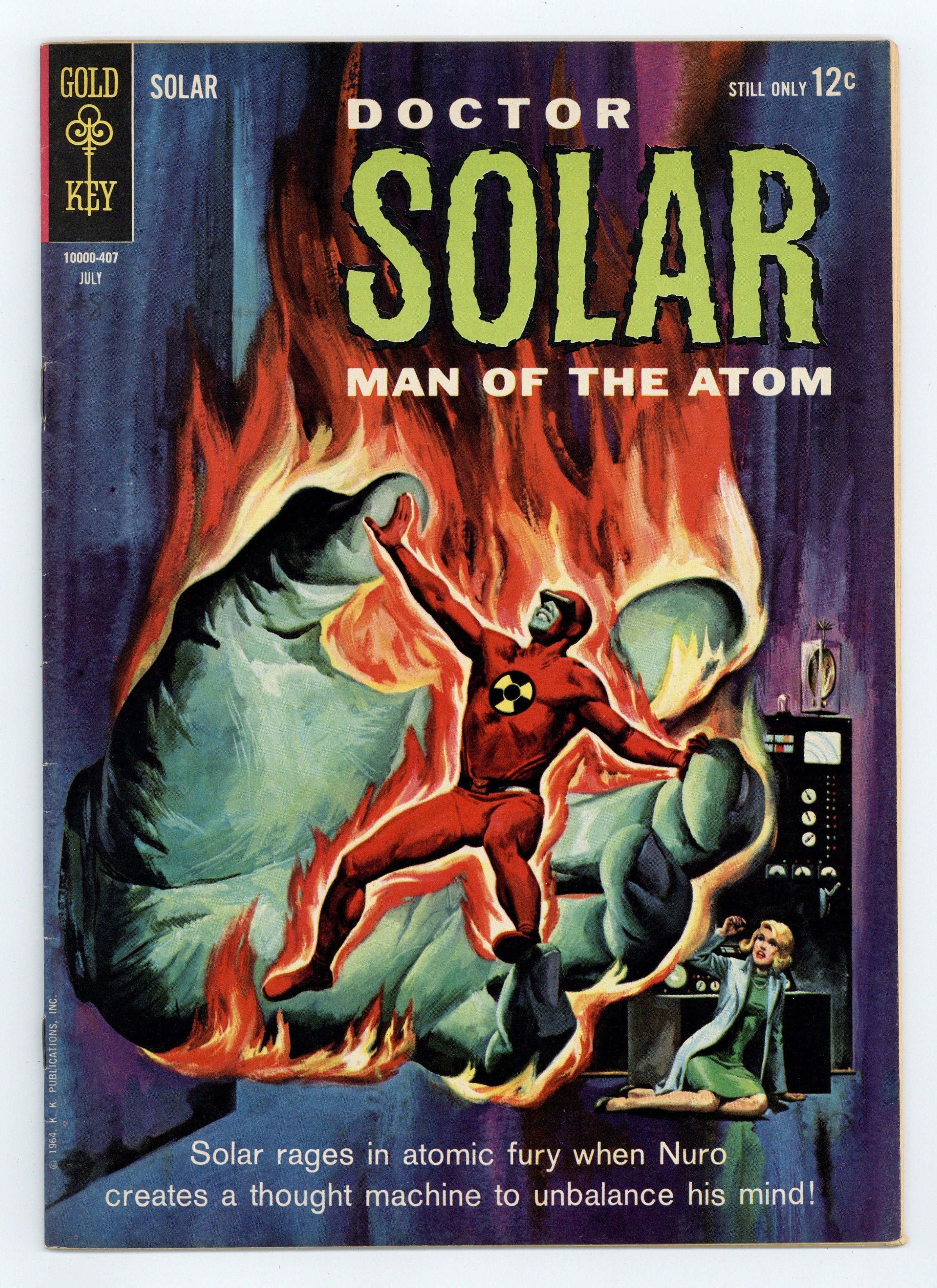 Dr. Solar in "The Thought Controller!" and "The Final Challenge!" Professor Harbinger back-up story, "Magic Fuel!" Painted front and back covers. Number on cover 10000-407 July. Cover price $0.12.