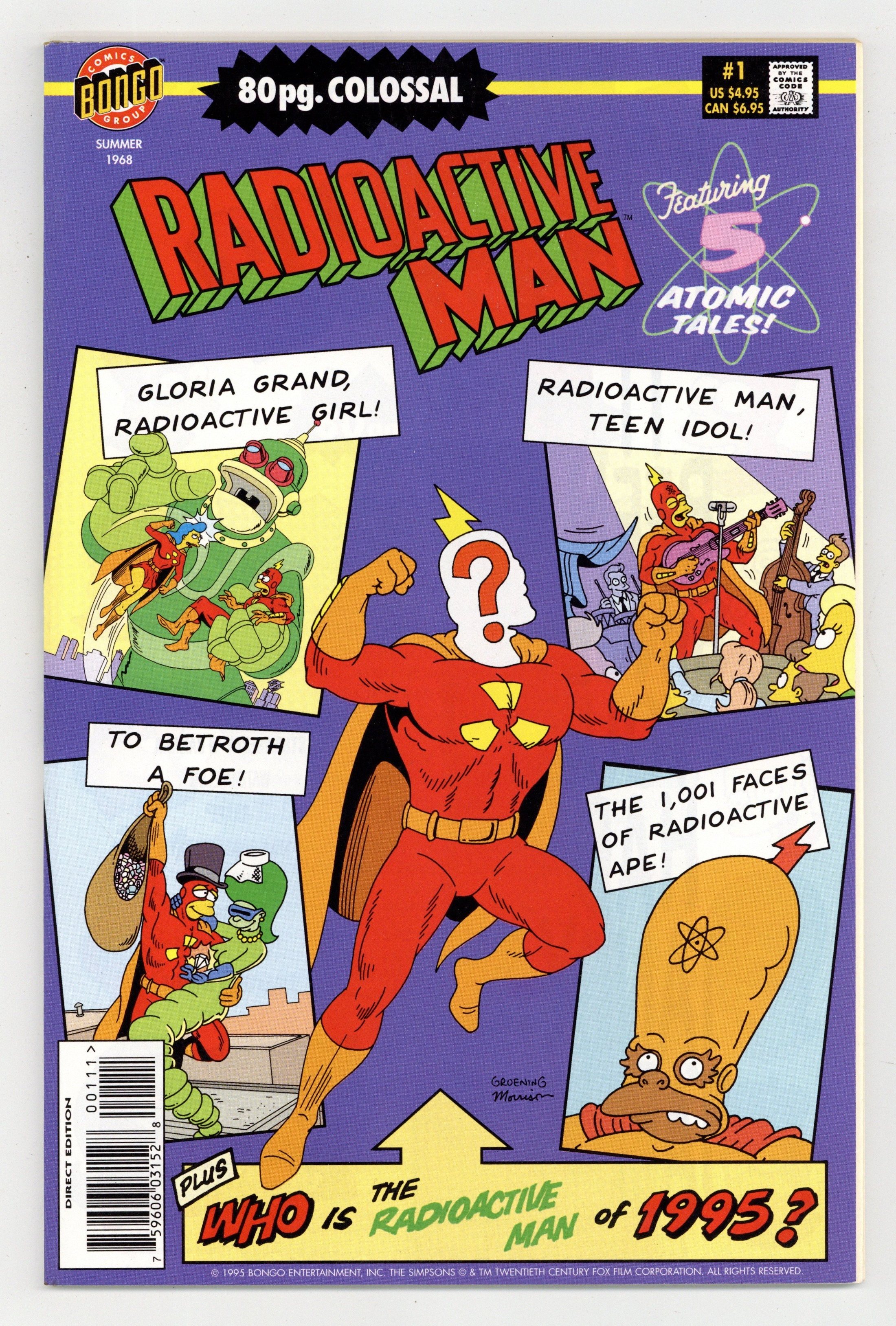 Cover by Bill Morrison. "To Betroth a Foe!", script by Bill Morrison, pencils by Christian Roman, inks by Tim Harkins; Larva Girl tries to trick Radioactive Man into marrying her. "Radioactive Man, Teen Idol," script by Bill Morrison, pencils by Stephanie Gladden, inks by John Adam; Radioactive Man performs at a rock concert in order to separate Larceny Lass and her gang. "The 1,001 Faces of Radioactive Ape," script and pencils by Scott Shaw!, inks by Phil Ortiz; Radioactive Man must sub for Radioactive Ape when his body suddenly goes through a metamorphosis. "Gloria Grand Radioactive Girl," script by Kaye Morrison, art by Bill Morrison; Gloria Grand gains radioactive powers, which gives her a shot at finally marrying Radioactive Man. "The Radioactive Man of 1995!", script by Bill Morrison, pencils by Sharon Bridgeman, inks by Abel Laxamana; Gloria Grand is accidently sent to the future, to the year 1995. Radioactive Man character profile. 84 pgs. $4.95. Cover price $4.95.