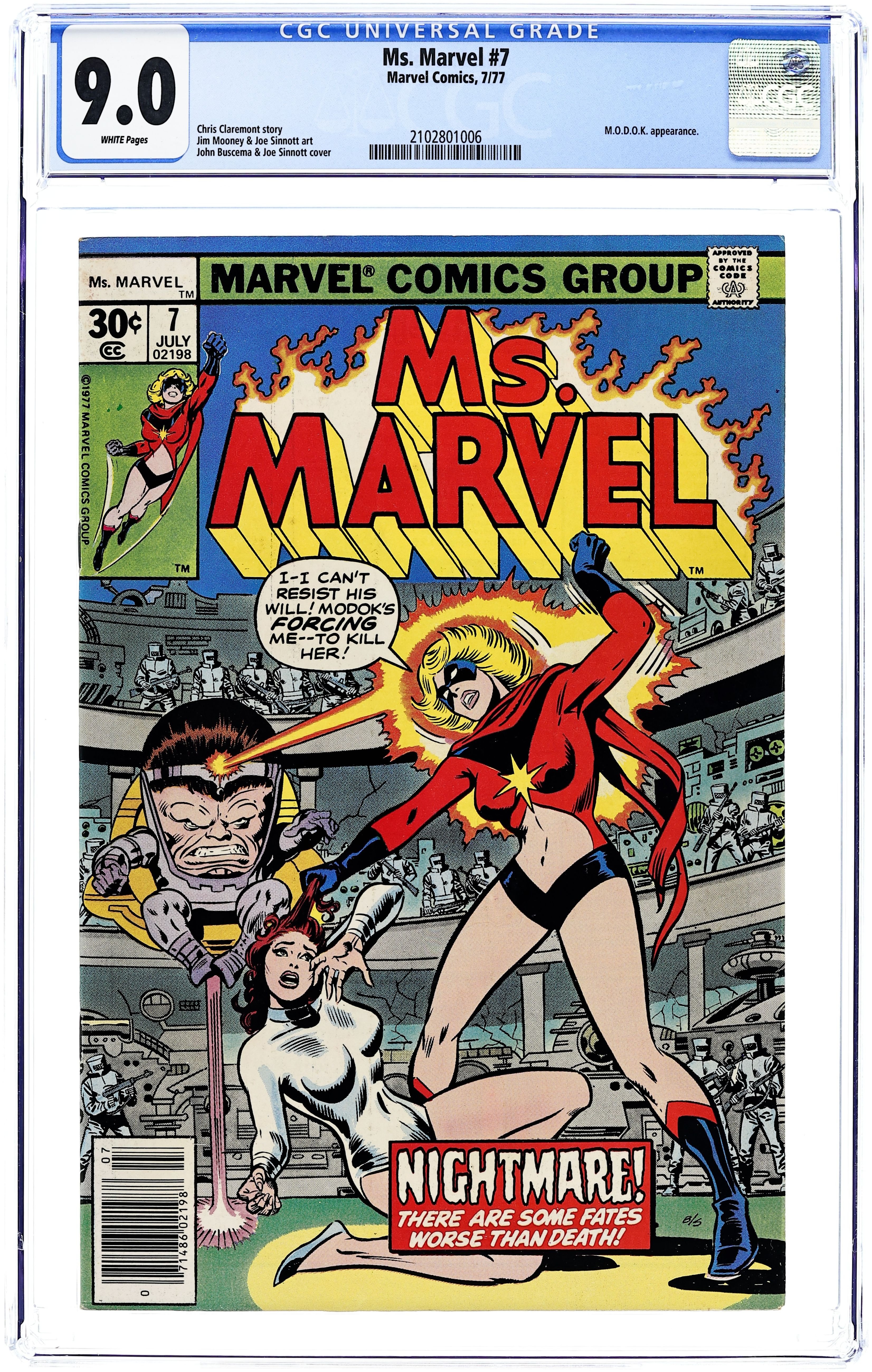 Cover pencils by John Buscema, inks by Joe Sinnott. Nightmare!, script by Chris Claremont, pencils by Jim Mooney (breakdowns) and Joe Sinnott (finished art), inks by Joe Sinnott; Ms. Marvel finds herself trapped in an underground AIM complex and her suit has been taken to give one of the enemy agents her power; When this doesn't work, Modok tries to control Ms. Marvel's mind but she breaks his conditioning and escapes. 36 pgs. $0.30. Cover price $0.30.