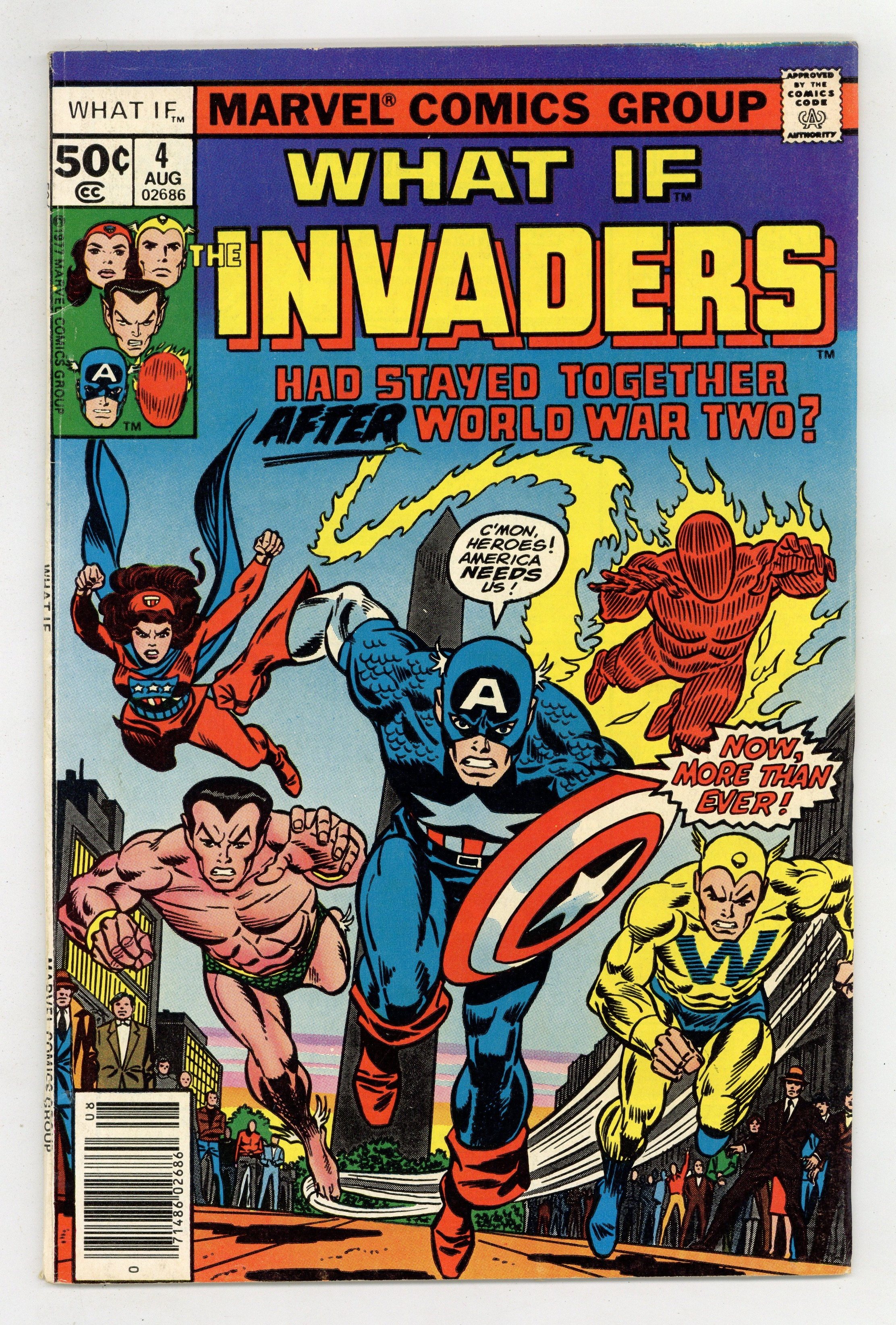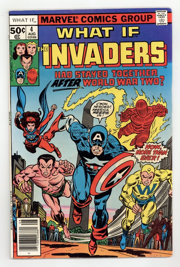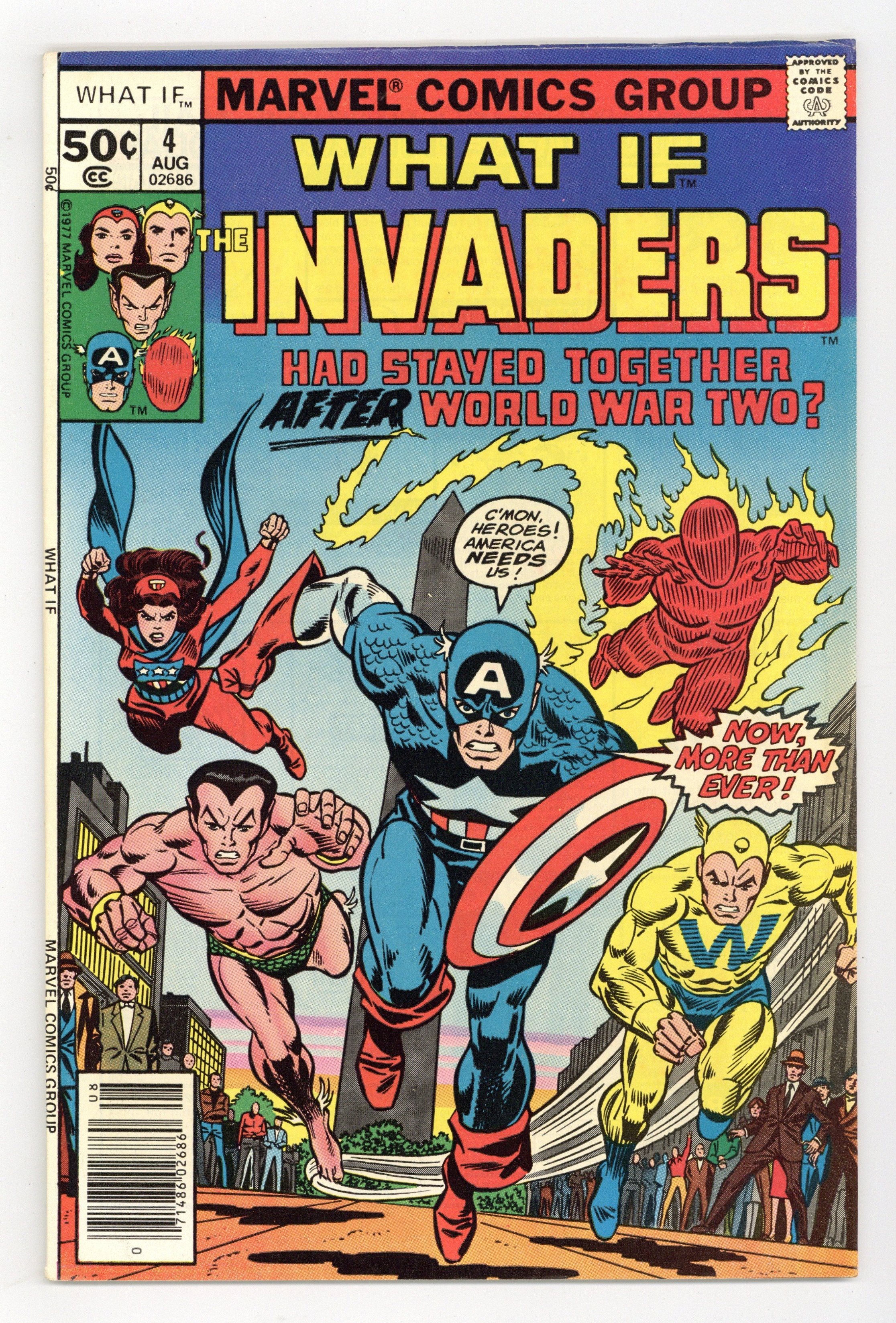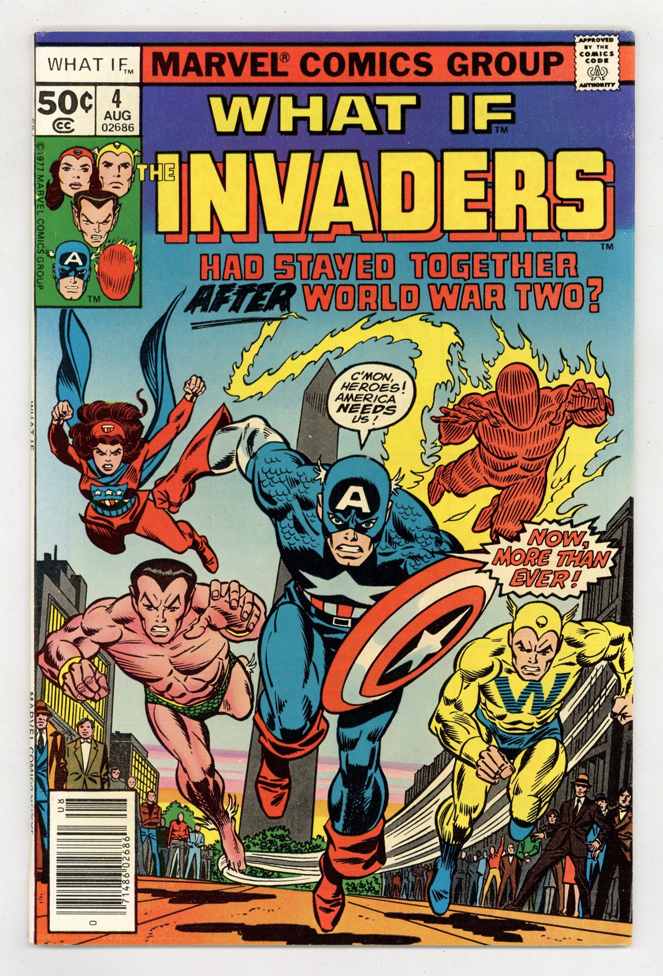 Cover pencils by Gil Kane, inks by Frank Giacoia. What if the Invaders Had Stayed Together After World War Two? starring the Invaders, script by Roy Thomas, pencils by Frank Robbins (breakdowns) and Frank Springer (finished art), inks by Frank Springer; This story is in continuity and explains the post-1945 Captain America; It features the death of the Spirit of '76 (Cap II) and the introduction of the Patriot as Capt III. Hostess Twinkie ad with Spider-Man, pencils by Ross Andru, inks by Mike Esposito. Article by Roy Thomas called Why Not? 52 pgs. Cover price $0.50.