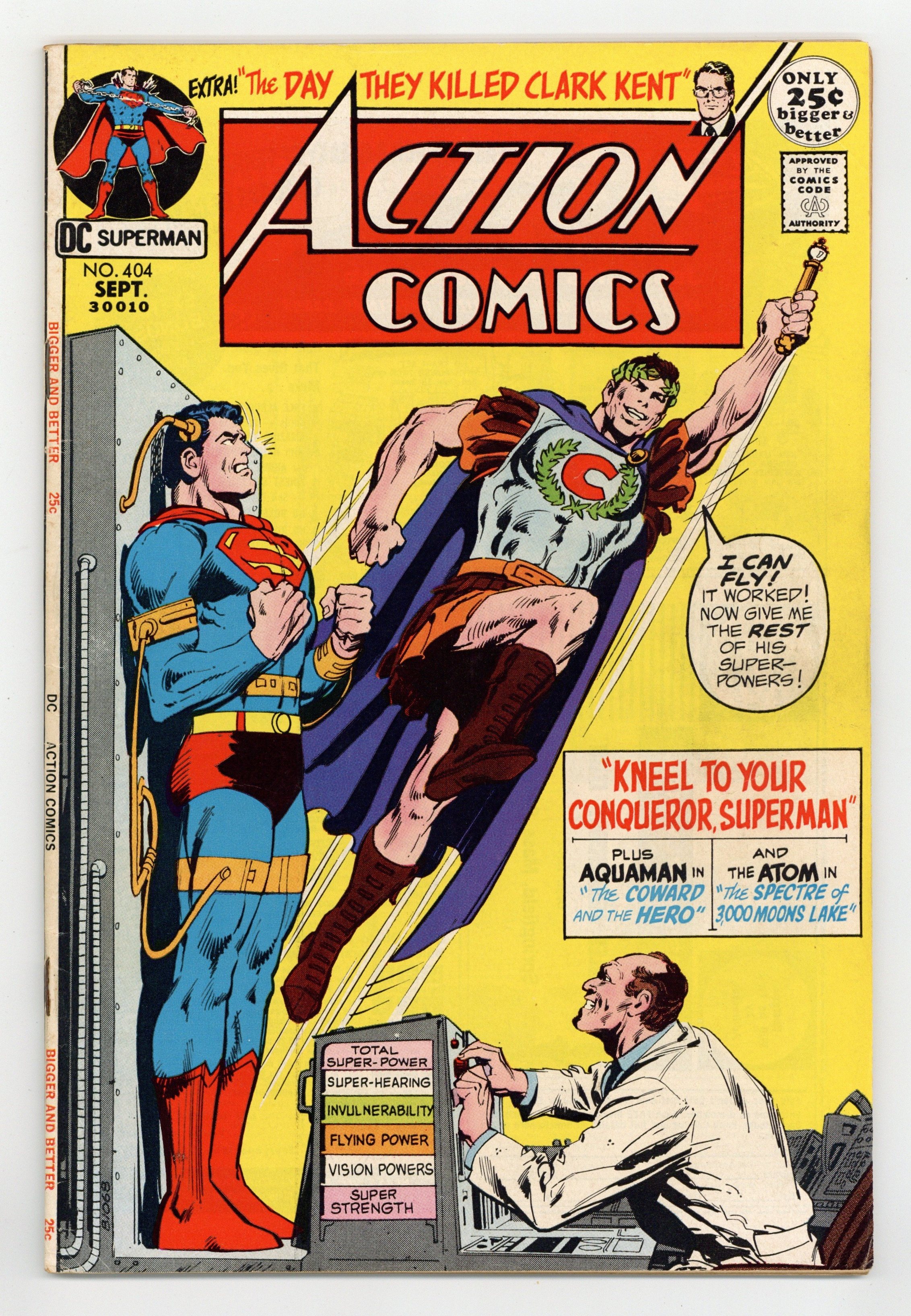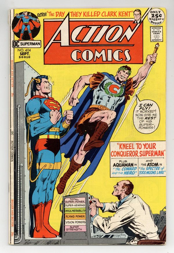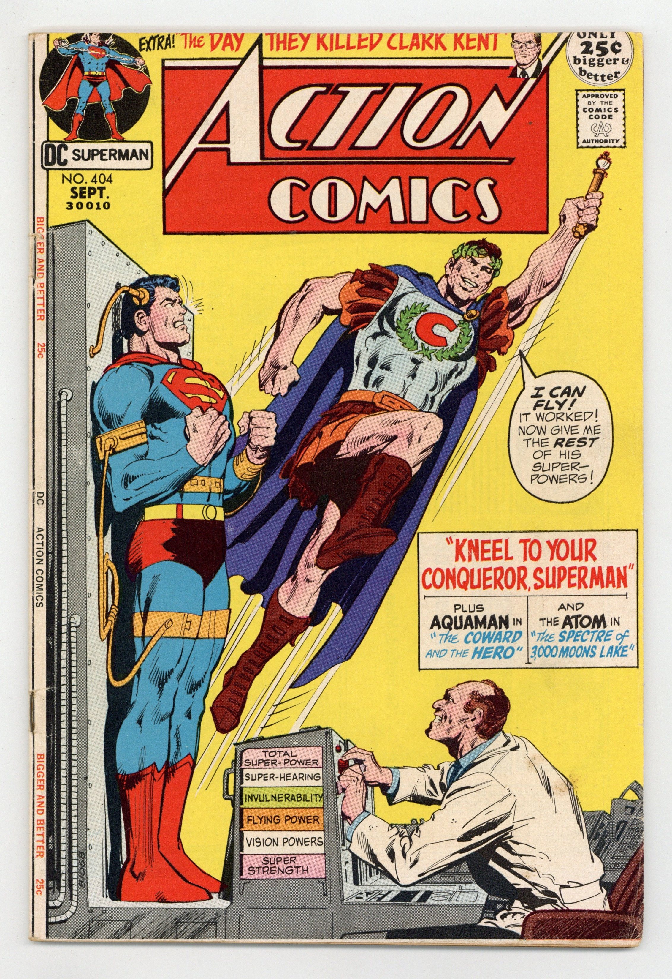 52-page giant. Cover pencils by Neal Adams, inks by Dick Giordano. "Kneel to Your Conqueror, Superman!", script by Leo Dorfman, pencils by Curt Swan, inks by Murphy Anderson; Genius Caesar tries to siphon Superman's powers into his body so he can become a superhero. Classic Atom reprint, "The Specter of 3000-Moons Lake!", script by Gardner Fox, pencils by Gil Kane, inks by Murphy Anderson; The Atom must find out who is pretending to be the ghost of 3000 Moons Lake. Classic Aquaman reprint, "The Coward and the Hero," script by Jack Miller, art by Ramona Fradon; Johnny Blake is tormented by others over his fear of water, but Aquaman helps him overcome his fear. "The Day They Killed Clark Kent," script by Leo Dorfman, pencils by Curt Swan, inks by Murphy Anderson; A college fraternity tries to haze Clark Kent. 52 Pages, Full Color. $0.25 Cover price $0.25.