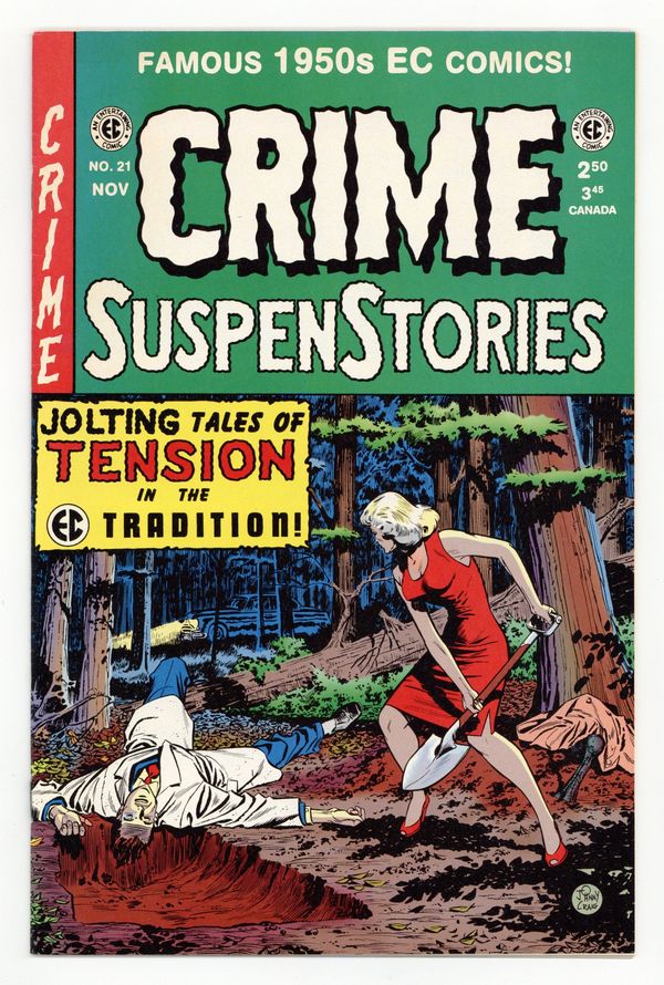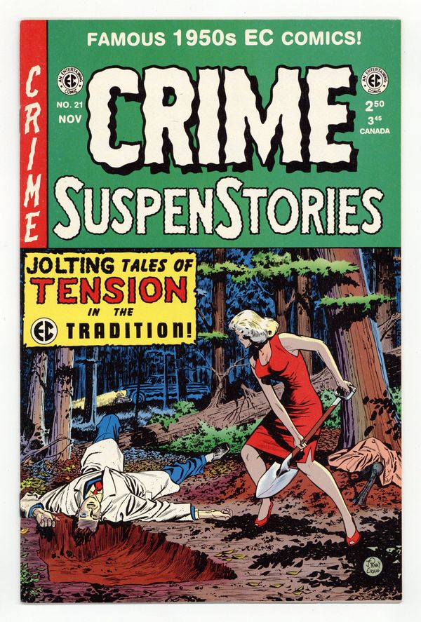 Reprints of classic EC stories. Cover art by Johnny Craig. "Mother's Day," script by Bill Gaines (co-plot) and Al Feldstein (co-plot, script), art by Reed Crandall; Brothers Fred and Harold grew up with Harold given the best of everything, and Fred began to hate his brother; One day, Fred discovered that Harold had committed a theft and decided to take the rap for his brother and went to jail. "In the Groove," script by Albert B. Feldstein, art by Jack Kamen; A small-time radio announcer devises a plot to kill his wife, while he was broadcasting at the radio station; But he does not foresee a snag in those plans with the pre-recorded record he made and was playing over the airwaves. "On Schedule!" text story by Albert B. Feldstein. "Understudies!", script and art by Johnny Craig; Gail and Jim are unhappily married to their respective spouses, but, in fact, love one another; They decide on a daring plan to kill their mates and dissolve their bodies in quicklime to leave no trace. "Blood Brothers," script b Bill Gaines (plot) and Albert B. Feldstein (plot, script), art by George Evans; Alex arrives unannounced at the beach house of his brother who invites him to stick around and stay with him; Alex's intent is to kill his brother after putting into place a whole series of alibis. 36 pgs., full color. Cover price $2.50.