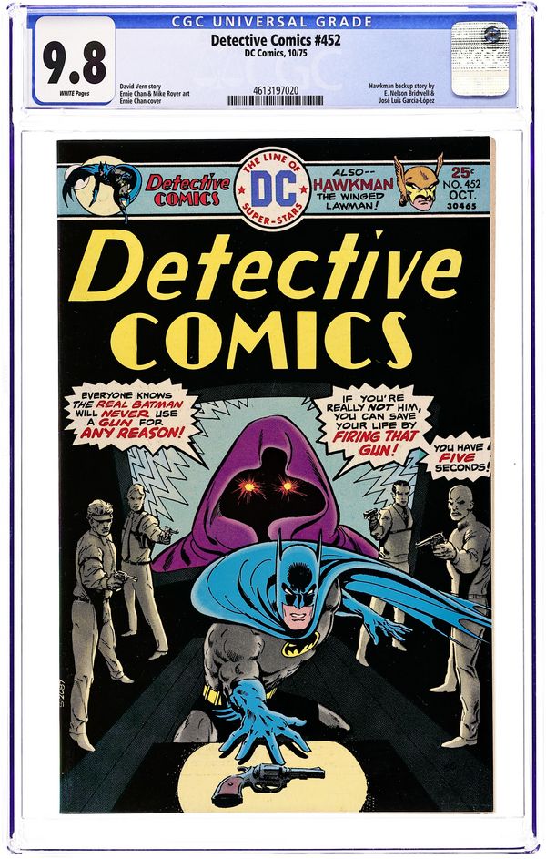 Cover by Ernie Chan. "Crackdown on the Crime Exchange," script by David Vern (as David V. Reed), pencils by Ernie Chan, inks by Mike Royer; Batman responds to a police radio transmission and accompanies two officers into the Tower Building; Guards reported strange hammering sounds on the 25th floor; As an auction of valuable coins will soon occur on the 30th floor, Batman investigates the roof and finds a torn access door. "The Curse of the Ancient Weapons!," script by E. Nelson Bridwell, art by Jose Luis Garcia-Lopez; Carter Hall is at the airport picking up some artifacts for his museum when a wizard and his raven appear; Carter changes to Hawkman and attacks with a flail but the wizard casts a spell causing the flail to swing towards Hawkman instead. Hostess snack cakes ad with Shazam and Minerva Menace. 36 pgs., full color. $0.25. Cover price $0.25.