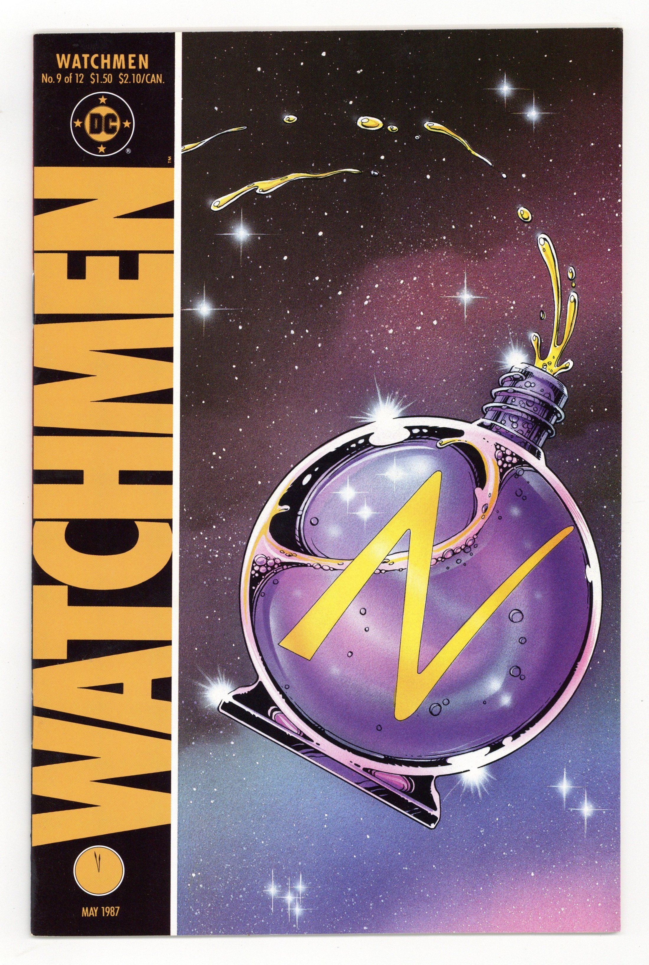 "The darkness of mere being". Part 9 of 12. Story by Alan Moore. Art and cover by Dave Gibbons. As the Silk Spectre attempts to convince Dr. Manhattan to return to Earth, she learns the shocking truth about her parentage. Includes four page fictional text feature with pieces from the scrapbook of Sally Jupiter. 32 pages. Full color. No ads. Cover price $1.50.