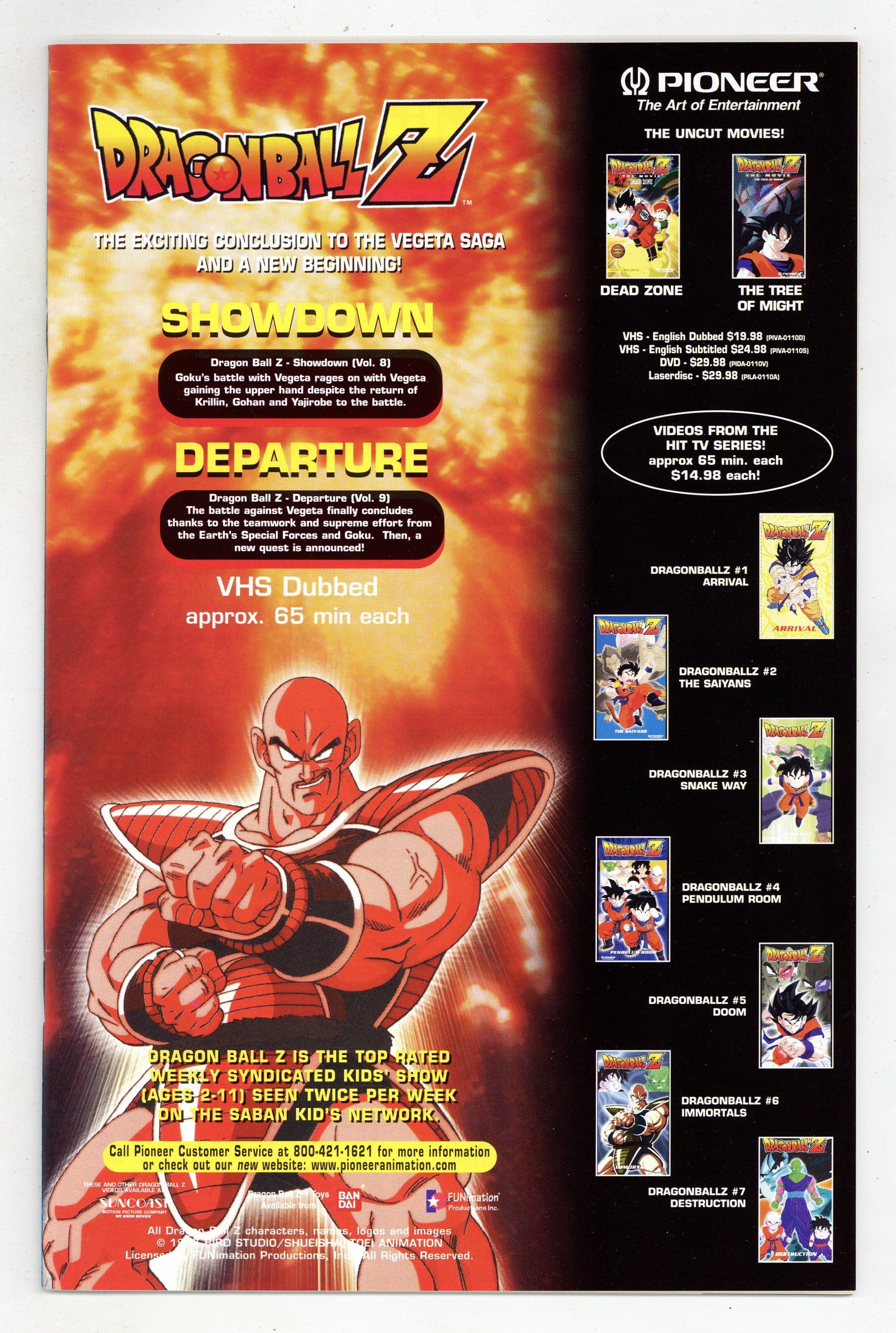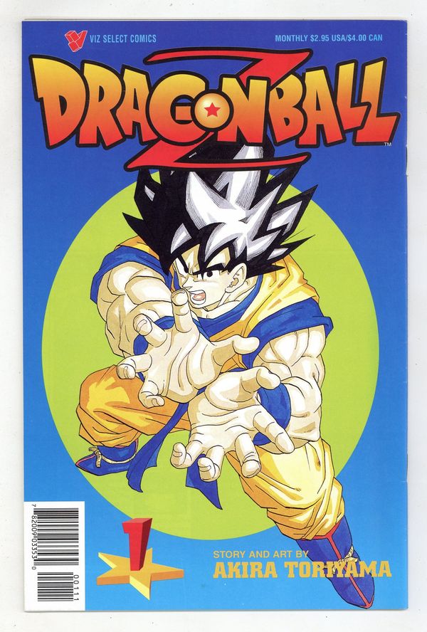 1st printing. Story and Art by Akira Toriyama. As seen on the hit animated TV series! Printed right to left like authentic Japanese manga! Young Goku has grown up, and his years of training have made him one of Earth's ultimate warriors, if not the ultimate warrior. But the stakes are increasing as ever deadlier threats appear, including a super-powerful race from outer space that lives for the thrill of combat. Now Goku and his friends must put their very lives on the line in the utmost test of martial arts skill! Dragon Ball Z is pure action adrenaline, with battles of literally earth-shaking proportions! 32 pages, B&W. Cover price $2.95.
